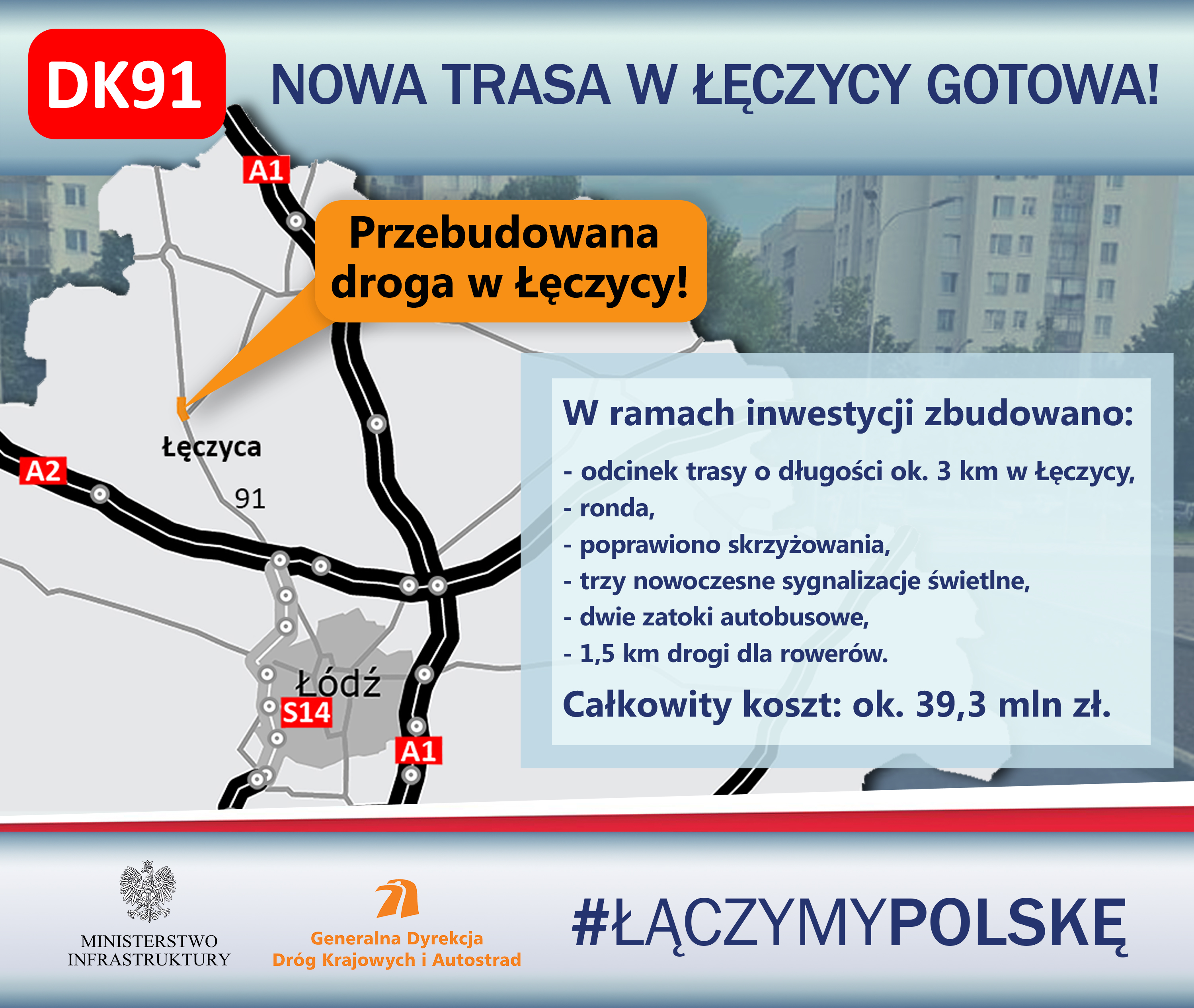 10 grudnia 2021 r. oficjalnie zakończyła się przebudowa drogi krajowej nr 91 w Łęczycy. Prace objęły liczący nieco ponad 3 kilometry odcinek trasy, na której wymieniona została m.in. cała konstrukcja drogi, dzięki czemu spełnia ona najwyższe normy nośności. Oznacza to, że mogą po niej jeździć samochody o nacisku 11,5 tony na oś. Koszt przebudowy trasy to ok. 39,3 mln zł.