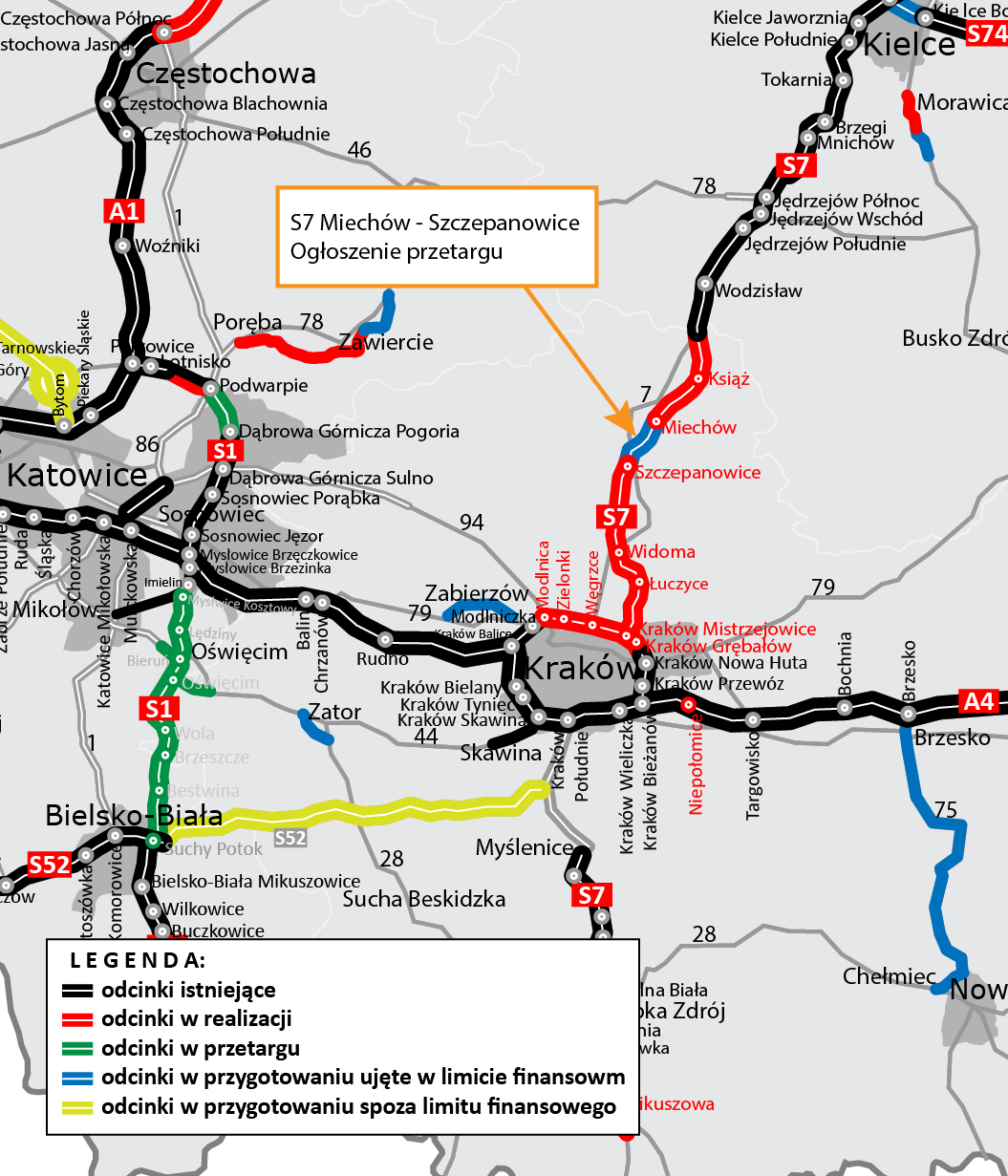 Generalna Dyrekcja Dróg Krajowych i Autostrad ogłosiła przetarg na projekt i budowę odcinka drogi ekspresowej S7 pomiędzy węzłami Miechów i Szczepanowice. Zainteresowani wykonawcy mogą składać oferty do 26 czerwca 2020 r. Jest to ostatni odcinek S7 na terenie Małopolski.