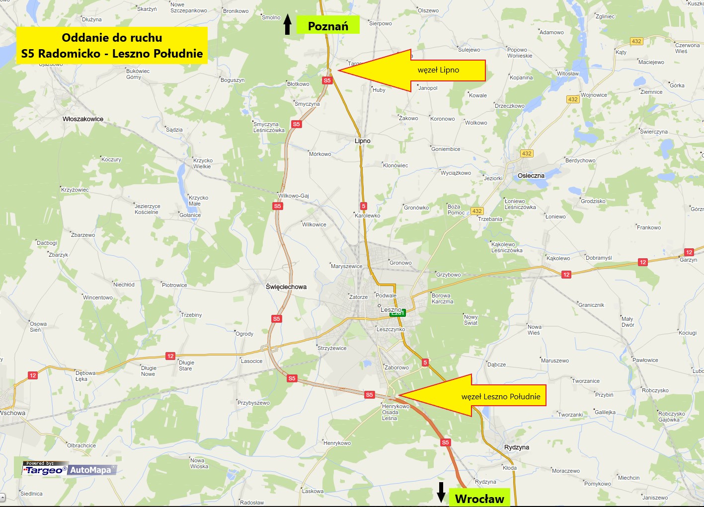 Generalna Dyrekcja Dróg Krajowych i Autostrad, 9 listopada 2018 r., oddała do ruchu 19-kilometrowy odcinek drogi ekspresowej S5 od Radomicka do Leszna. Jest to kolejny fragment drogi ekspresowej łączącej Poznań z Wrocławiem. Całą trasą pojedziemy w przyszłym roku, po oddaniu do użytku trzech realizowanych odcinków.