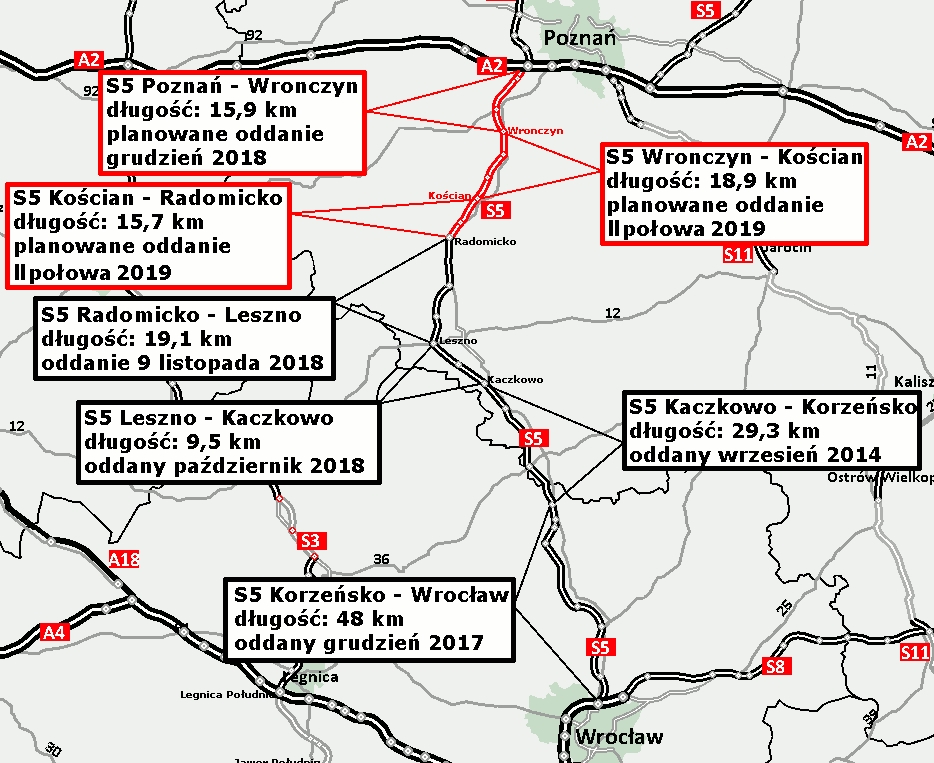 - Wronczyn - Kościan Południe (18,9 km) - ukończenie planowane w II połowie przyszłego roku,