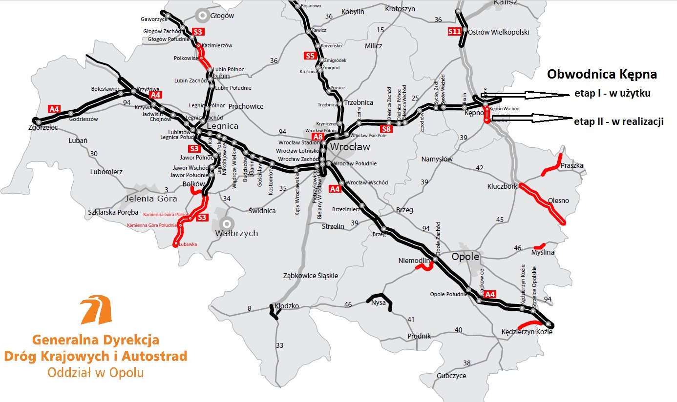 Obwodnica Kępna, w ciągu nowego odcinka drogi ekspresowej S11, realizowana jest w dwóch etapach. W pierwszym, na który umowę podpisano w październiku 2015 r., powstał odcinek drogi ekspresowej o długości ok. 3,6 km, prowadzący na północ od węzła Kępno na S8. Wykonawca, firma Budimex, zrealizowała go za kwotę 73 mln złotych. Wybudowano trzy obiekty inżynierskie: przejście dla zwierząt średnich w ciągu drogi ekspresowej, wiadukt nad drogą ekspresową S11 w ciągu drogi powiatowej oraz wiadukt nad linią kolejową. Kierowcy wjechali na odcinek obwodnicy zrealizowany w I etapie w maju 2018 r., czyli dwa miesiące przed terminem.