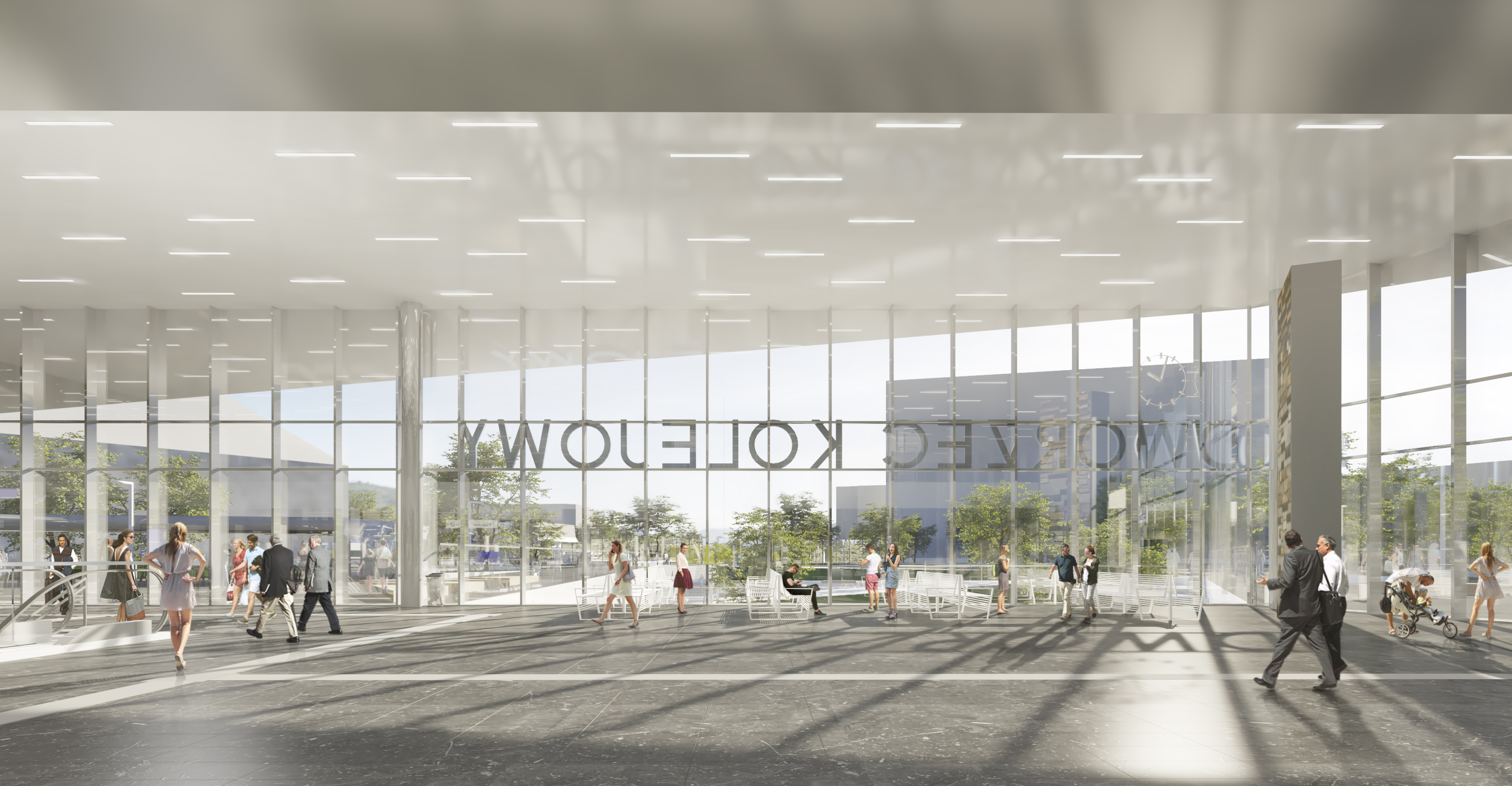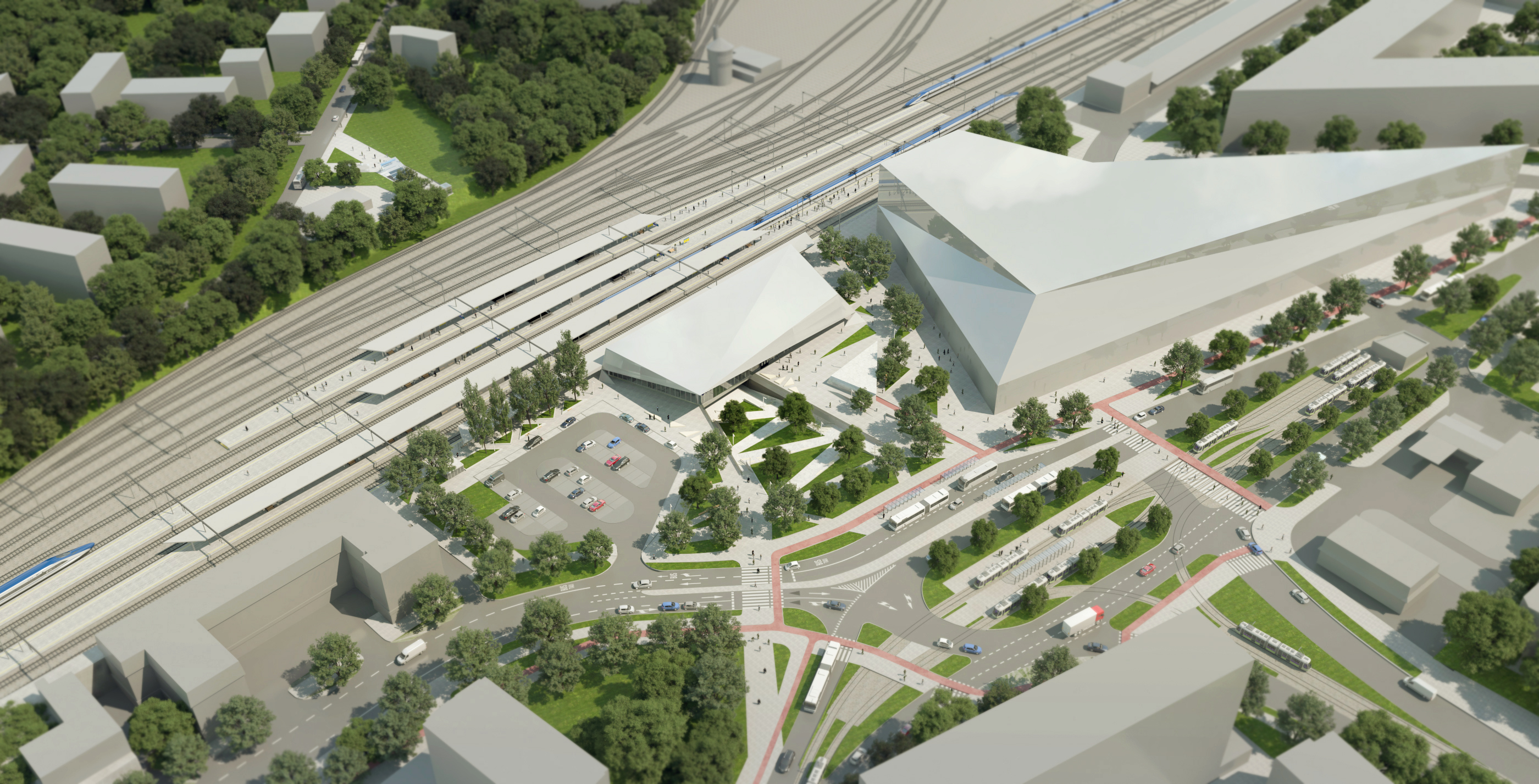 Metamorfozę przejdzie również przestrzeń przed dworcem. Zaprojektowano ją jako reprezentacyjny plac miejski przecięty wizualnie ciągami pieszymi z pochylniami i schodami prowadzącymi do przejścia podziemnego, które przechodzi pod dworcem i łączy się z poziomem -1 budynku, gdzie zlokalizowano powierzchnie obsługi podróżnych oraz usługowe. Po jego zachodniej stronie zaprojektowano parking naziemny posiadający łącznie 58 miejsc postojowych, w tym 43 miejsca dla samochodów osobowych, cztery dla osób z niepełnosprawnościami, dwa do ładowania pojazdów elektrycznych, a także strefę kiss&ride oraz dostaw, postój taxi i zatoczkę autobusową. Po wschodniej stronie placu znajdzie się trójkątna wiata rowerowa z 80 miejscami parkingowymi dla jednośladów, do której będzie prowadzić nowy fragment ścieżki rowerowej. Centralna część placu to jednak nie tylko zejście w kierunku tunelu, ale również przestrzeń rekreacyjna, z powierzchniami zielonymi zlokalizowanymi na trójkątnych wyspach. Zostaną tam zasadzone nowe rośliny, w tym drzewa. Planuje się, że przestrzeń bioaktywna na placu zajmie przeszło 1300 m kw. Na obrzeżu wysp zaprojektowano drewniane siedziska. W godzinach wieczornych nowa aranżacja placu zostanie podkreślona przez iluminację nocną, czyli latarnie oraz oświetlenie dekoracyjne w postaci linii świetlnych i opraw punktowych podkreślających elementy małej architektury oraz zieleń. Plac przed dworcem zaprojektowano bardzo funkcjonalnie, gdyż łączy w sobie funkcje rekreacyjną z czysto użytkową.