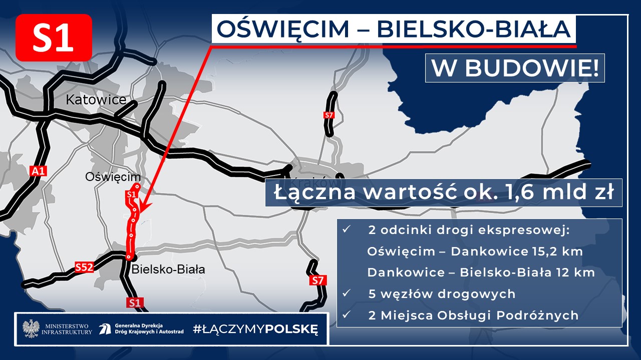 Generalna Dyrekcja Dróg Krajowych i Autostrad przekazała wykonawcom place budowy odcinków drogi ekspresowej S1 pomiędzy Oświęcimiem a Dankowicami oraz pomiędzy Dankowicami a Bielskiem-Białą. Inwestycje te powstają w ramach realizacji trasy S1 pomiędzy Mysłowicami a Bielskiem-Białą o łącznej długości ok. 40 km i wartości prawie 2,3 mld zł.