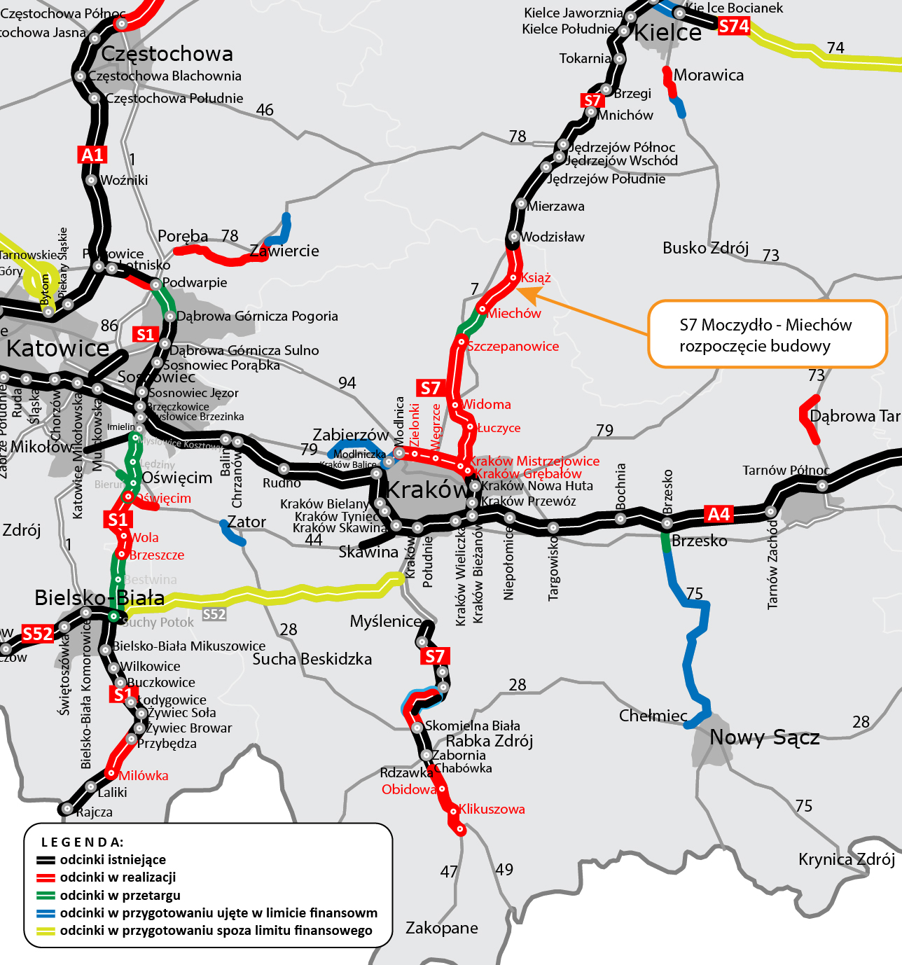 S7 Moczydło – Miechów to jeden z czterech budowanych odcinków tej trasy w województwie małopolskim na północ od Krakowa. Wraz z pozostałymi fragmentami będzie stanowić połączenie realizowanej obecnie Północnej Obwodnicy Krakowa w ciągu S52 z użytkowaną już drogą S7 w kierunku Warszawy. Kolejne trzy odcinki realizacyjne prowadzące od obwodnicy Grójca do Południowej Obwodnicy Warszawy w ciągu S2 również są w budowie. Kolejne fragmenty S7 na północ od Warszawy są na różnych etapach realizacji. Wylot ze stolicy jest w trakcie prac przygotowawczych.