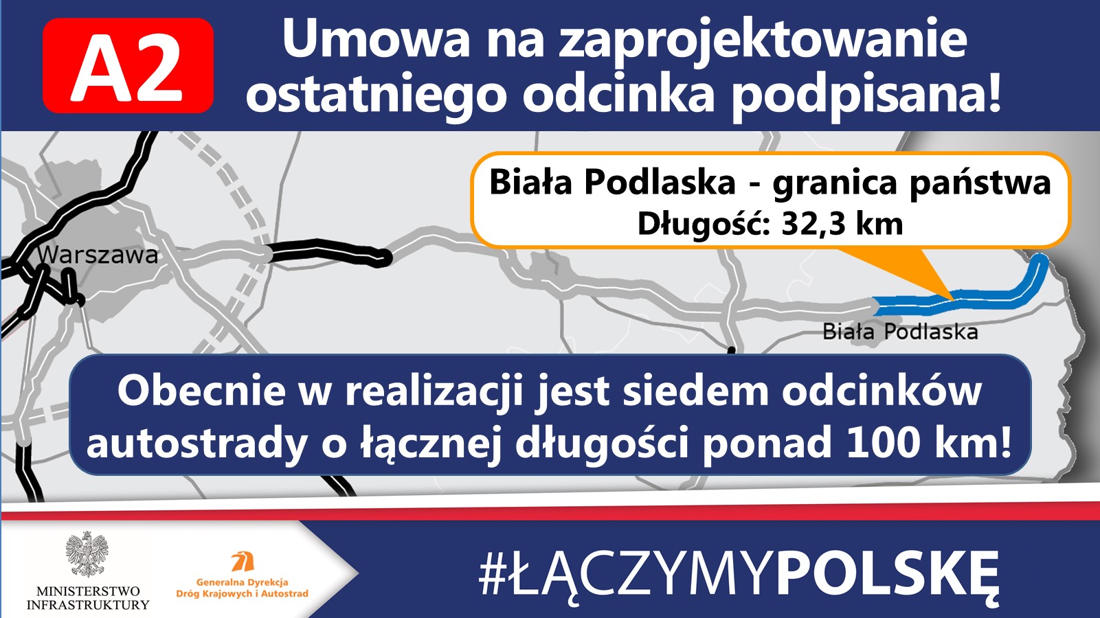 6 września 2021 r. Generalna Dyrekcja Dróg Krajowych i Autostrad podpisała umowę na zaprojektowanie ostatniego, 32-kilometrowego odcinka autostrady A2 pomiędzy Białą Podlaską a granicą państwa z Białorusią. Obecnie na wschód od Warszawy w realizacji jest siedem odcinków A2, w ramach których wybudowane zostanie ponad 100 km autostrady.