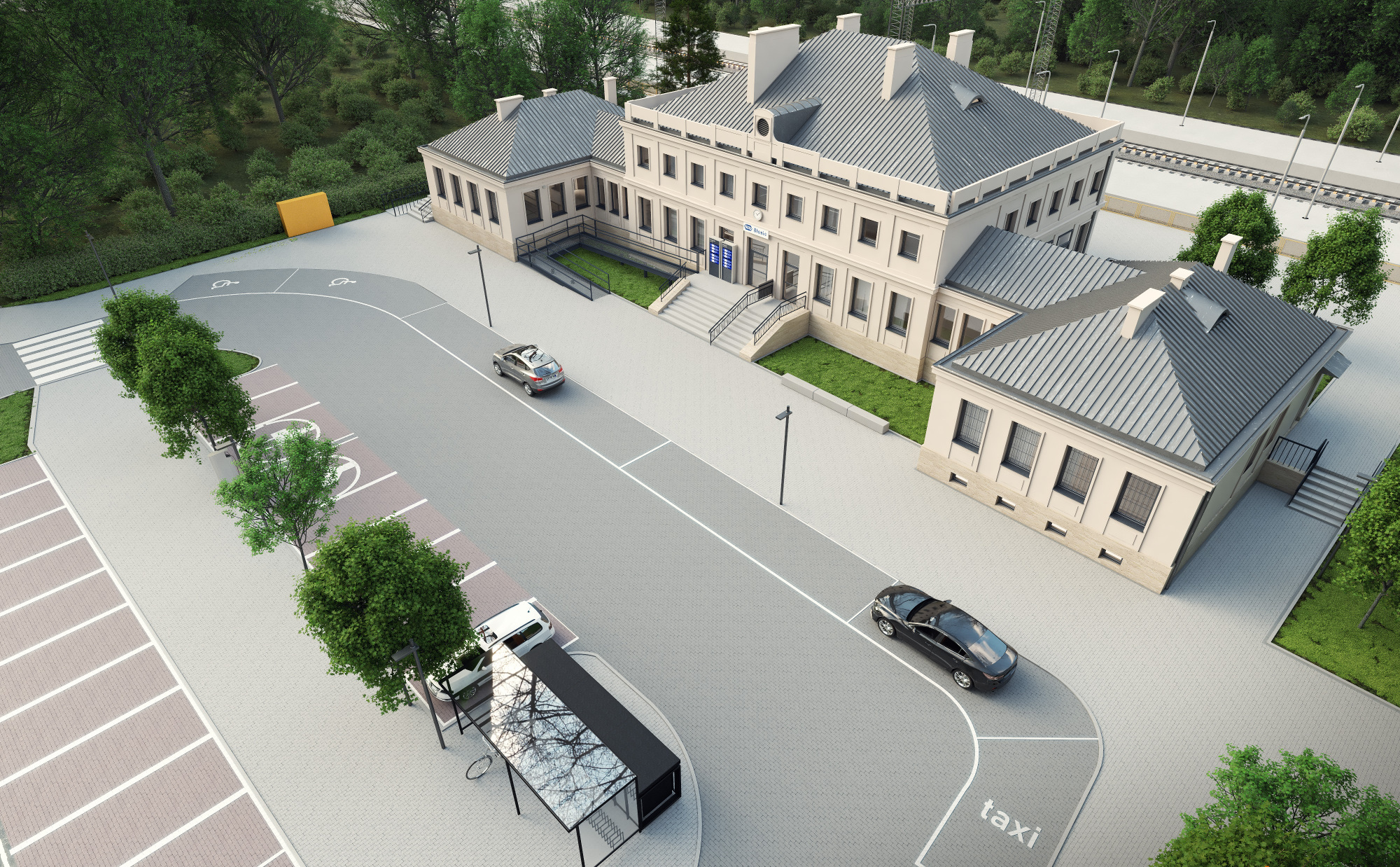 Modernizacja dworca to również zmiany w jego najbliższym otoczeniu. Całkowicie przebudowany zostanie plac przed budynkiem. Przystanek autobusowy, miejsca dla osób z niepełnosprawnościami oraz taksówek, strefa kiss&ride znajdą się bezpośrednio przed wejściem do budynku. Natomiast bliżej ulicy, wokół nowo projektowanej wyspy, na której znajdzie się również wiata dla rowerów, zlokalizowane będą pozostałe miejsca parkingowe. Plac dworcowy zyska również nowe chodniki oraz elementy małej architektury, w tym m.in. kosze i ławki.