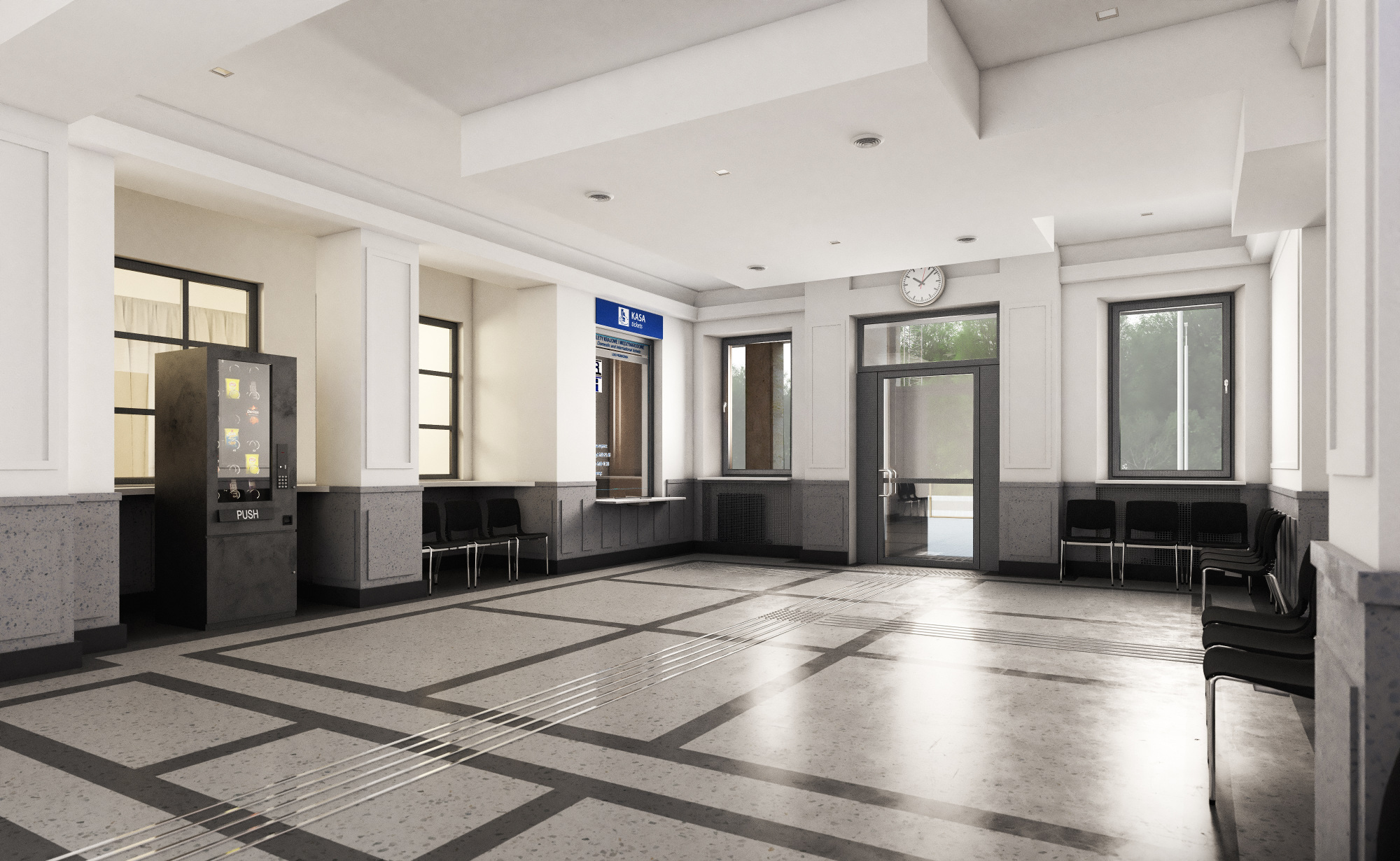 Wnętrze budynku będzie połączeniem elementów historycznych i nowoczesnych. W wystroju holu zostaną zachowane wykonane z lastryka: posadzka z geometrycznymi wzorami, okładziny i blaty. Nowe będzie także wyposażenie wnętrza – oświetlenie, ławki, kosze, zegar, gabloty na rozkłady jazdy oraz elektroniczne tablice przyjazdów i odjazdów pociągów. Wnętrze zaprojektowano w odcieniach bieli i szarości. Przy holu dworca będą się mieścić: pomieszczenie kasy biletowej, toalety oraz niewielki pasaż handlowy składający się z kilku lokali. Natomiast w skrzydle zachodnim budynku, tak jak dotychczas, usytuowana będzie lecznica dla zwierząt.
