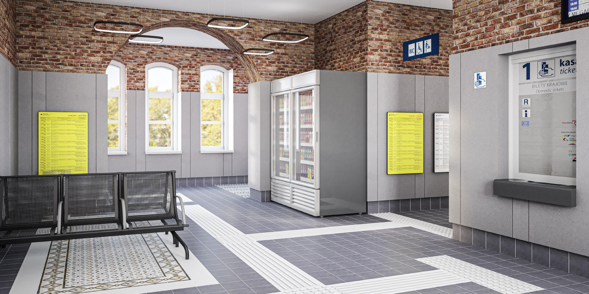 Na parterze historycznego dworca znajdzie się przestrzeń obsługi podróżnych składająca się z holu, poczekalni sezonowej, toalet oraz pomieszczeń kas biletowych. Wykończenie holu i poczekalni zaprojektowano w sposób nowoczesny i utrzymano w odcieniach bieli i szarości z nawiązaniem do ceglanej elewacji dworca w detalu ścian. Ciekawie zaprojektowano oświetlenie wnętrza w formie podwieszanych na linkach kwadratowych lamp zbudowanych z pasków LED. Przestrzenie obsługi podróżnych będą wyposażone ponadto w ergonomiczne ławki, kosze na śmieci, elektroniczne tablice przyjazdów i odjazdów pociągów oraz gabloty ścienne na rozkłady jazdy. Na parterze przewidziano również pomieszczenia dla jednej ze spółek kolejowych oraz prawie dwustumetrowy lokal na wynajem. Tego rodzaju powierzchnie znajdą się również na piętrze historycznego budynku.