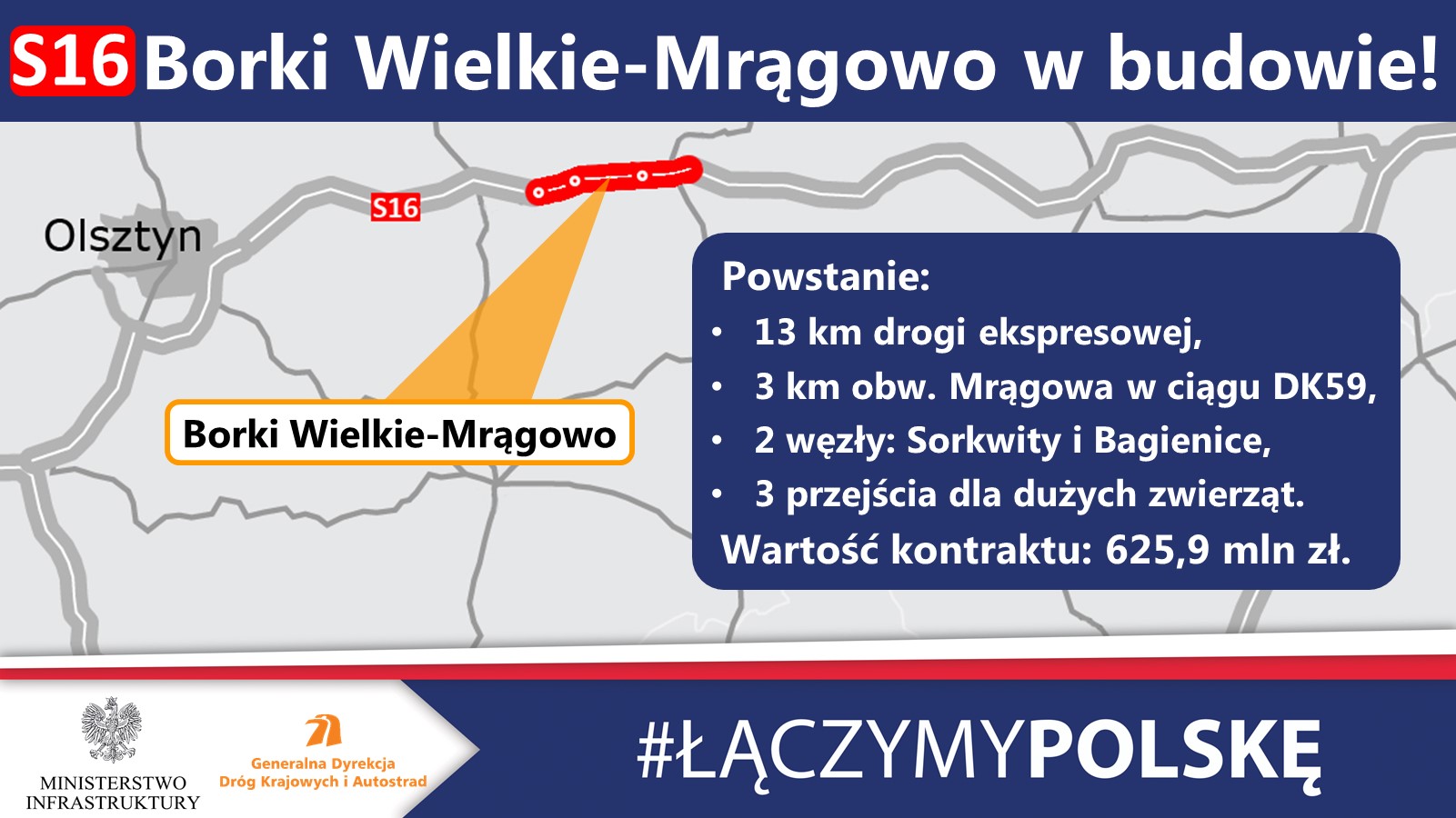 Odcinek S16 Borki Wielkie-Mrągowo, w systemie Projektuj i buduj, realizuje firma PORR. Inwestycja jest kolejnym etapem budowy drogi ekspresowej S16 w województwie warmińsko-mazurskim. Nowy odcinek będzie miał długość około 16 km, w tym około 13 km w ciągu S16 i około 3 km obwodnicy Mrągowa w ciągu drogi krajowej nr 59. Droga na odcinku S16 będzie miała przekrój dwujezdniowy, po dwa pasy ruchu w każdym kierunku, a na odcinku obwodnicy Mrągowa jednojezdniowy, po jednym pasie ruchu w każdym kierunku.