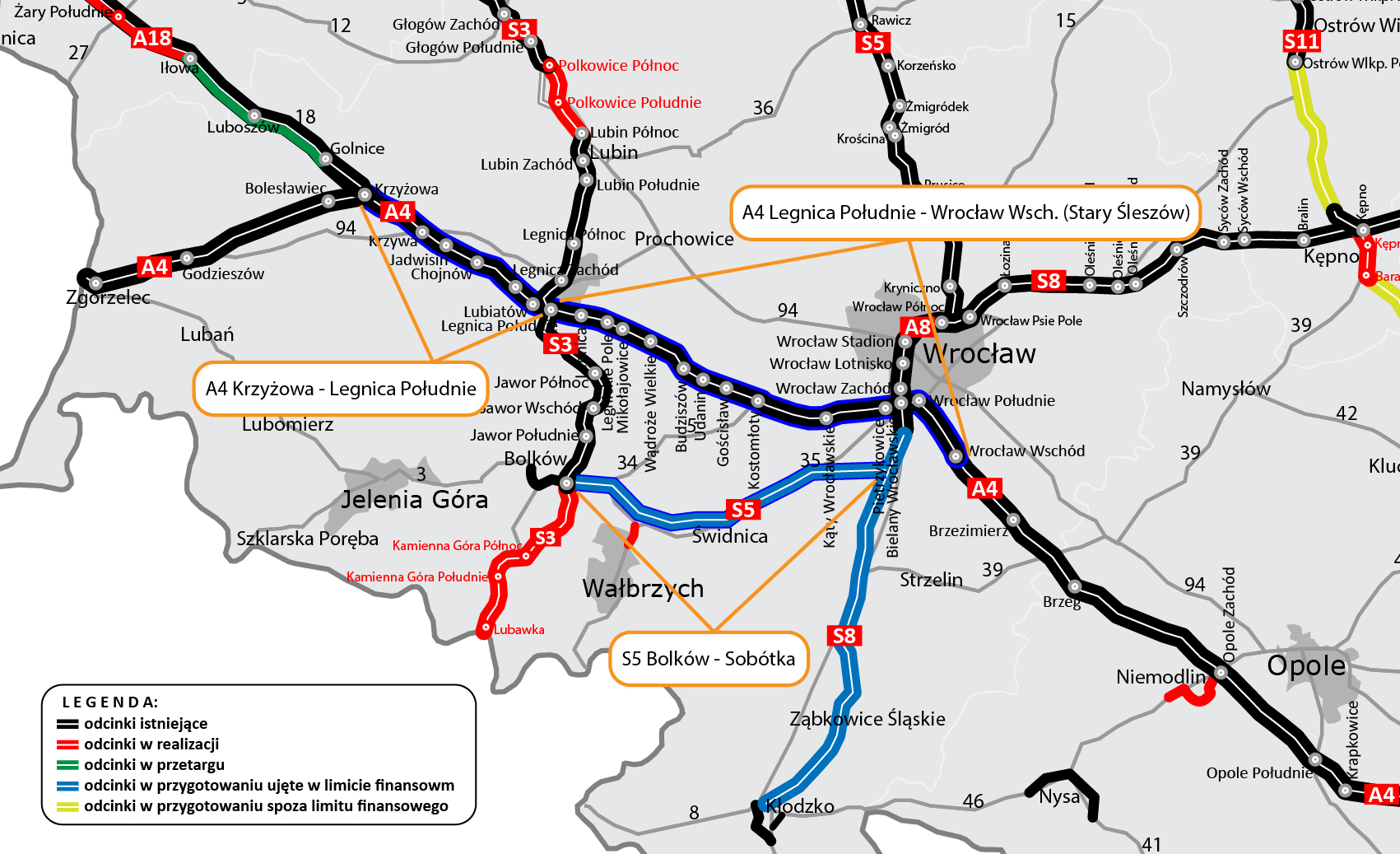 Generalna Dyrekcja Dróg Krajowych i Autostrad ogłosiła przetargi na opracowanie dokumentacji dla budowy lub rozbudowy autostrady A4 od Krzyżowej do Wrocławia oraz budowy drogi ekspresowej S5 od Sobótki do Bolkowa. Postępowania dotyczą opracowania Studium techniczno-ekonomiczno-środowiskowego z elementami koncepcji programowej (STEŚ-R) oraz Programem funkcjonalno-użytkowym (PFU).