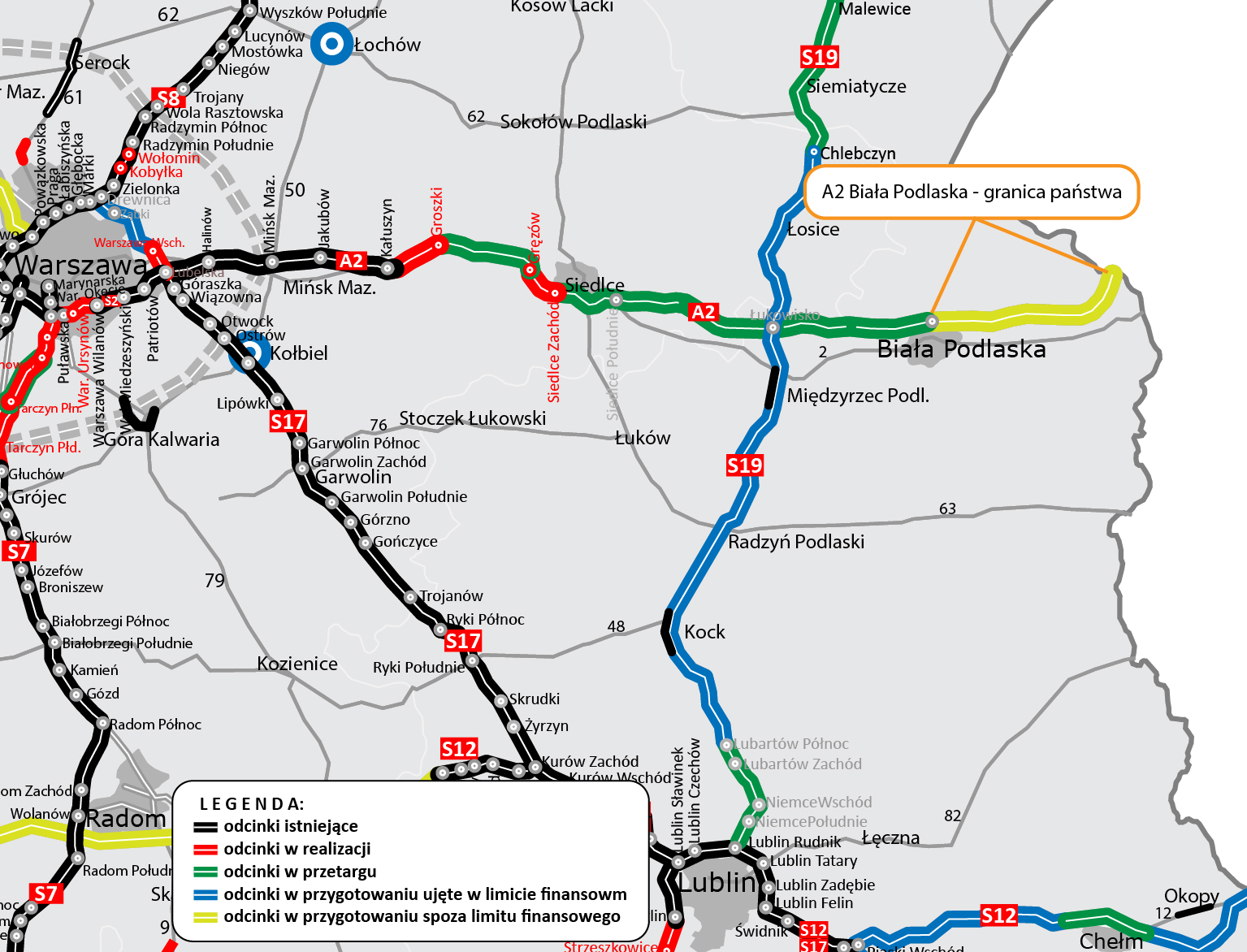 W sierpniu 2020 r. do ruchu został oddany ponad 15 km odcinek A2 pomiędzy węzłem Lubelska a obwodnicą Mińska Mazowieckiego. Wiosną ubiegłego roku zawarte zostały kontrakty na dwa kolejne odcinki autostrady pomiędzy węzłami Kałuszyn i Groszki oraz Gręzów i Siedlce Zachód. Przewidywany termin ukończenia prac to jesień 2023 r. W grudniu 2020 r. GDDKiA wybrała najkorzystniejszą ofertę w przetargu na projekt i budowę odcinka A2 węzeł Groszki - węzeł Gręzów. W toku są postępowania przetargowe dla czterech kolejnych odcinków pomiędzy węzłami Siedlce Zachód i Biała Podlaska.