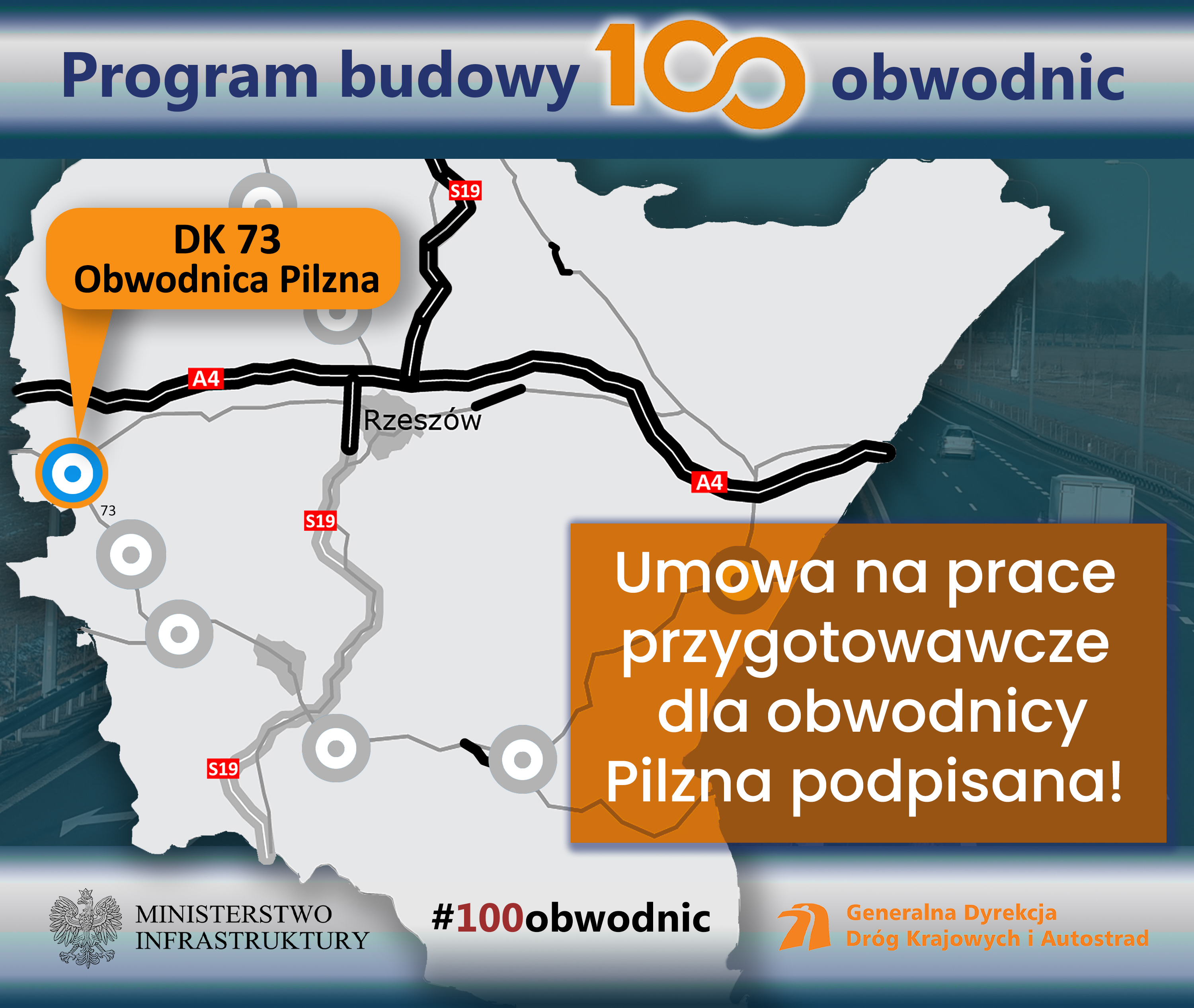Generalna Dyrekcja Dróg Krajowych i Autostrad podpisała umowę na wykonanie Koncepcji programowej dla budowy obwodnicy Pilzna w ciągu drogi krajowej nr 73. Tym samym wszystkie podkarpackie obwodnice, ujęte w rządowym Programie budowy 100 obwodnic na lata 2020-2030, są już na etapie opracowywania dokumentacji. Koncepcję programową opracuje w terminie 12 miesięcy Pracownia Inżynierska KLOTOIDA za ok. 1,5 mln zł.