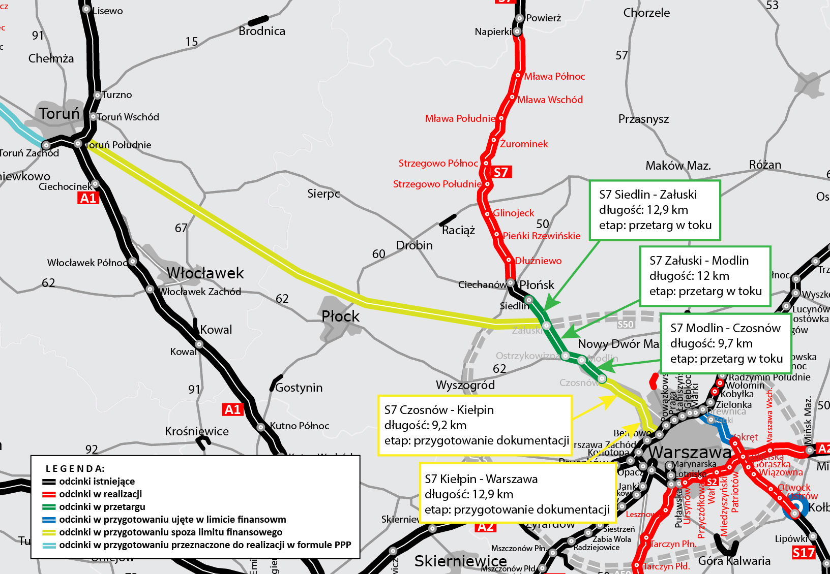Minister infrastruktury Andrzej Adamczyk zatwierdził aneksy do programów inwestycji dla odcinków drogi ekspresowej S7 od granicy województwa świętokrzyskiego do węzła Miechów (województwo małopolskie) oraz Modlin – Czosnów (województwo mazowieckie). Dzięki zwiększeniu finansowania dla tych zadań będzie możliwe zawarcie umów z wykonawcami i realizacja inwestycji.