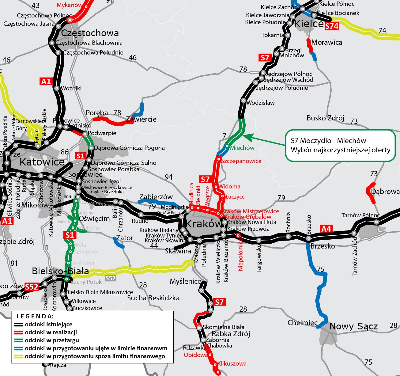 W przypadku odcinka S7 węzeł Miechów - węzeł Szczepanowice trwa procedura odwoławcza od decyzji środowiskowej w GDOŚ, jednocześnie prowadzone są prace geologiczne, dobiega końca opracowanie STEŚ. Prace na odcinku S7 Szczepanowice – Widoma rozpoczęły się we wrześniu 2019 r. i były prowadzone bez większych przerw także w okresie zimowym. Obecnie wykonywane są wykopy, nasypy i prace przy wznoszeniu podpór obiektów mostowych. Dla odcinka S7 Widoma – Kraków trwa procedura uzyskiwania decyzji ZRID (zgody na realizacje inwestycji) w Urzędzie Wojewódzkim.