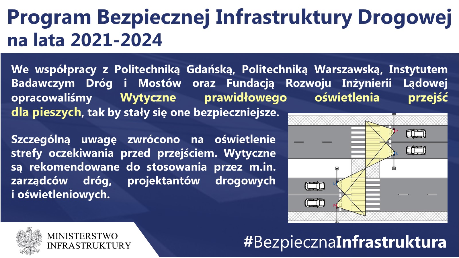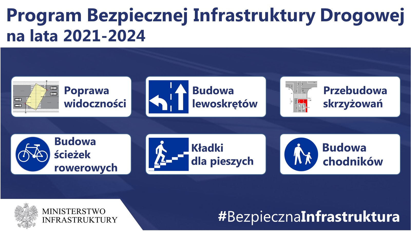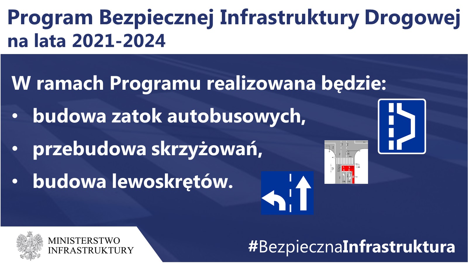 Rada Ministrów przyjęła przygotowany w Ministerstwie Infrastruktury Program Bezpiecznej Infrastruktury Drogowej na lata 2021-2024. Głównym celem Programu jest poprawa bezpieczeństwa ruchu drogowego na drogach krajowych w zarządzie Generalnej Dyrekcji Dróg Krajowych i Autostrad. Podejmowane w ramach Programu działania będą ukierunkowane na zwiększenie ochrony uczestników ruchu oraz stworzenie bezpiecznej infrastruktury drogowej – a w efekcie zmniejszenie liczby wypadków i ich ofiar. Na ten cel z Krajowego Funduszu Drogowego przeznaczymy 2,5 mld zł. Jest to pierwszy samodzielny program wieloletni z obszaru infrastruktury bezpieczeństwa ruchu drogowego na tak dużą skalę.