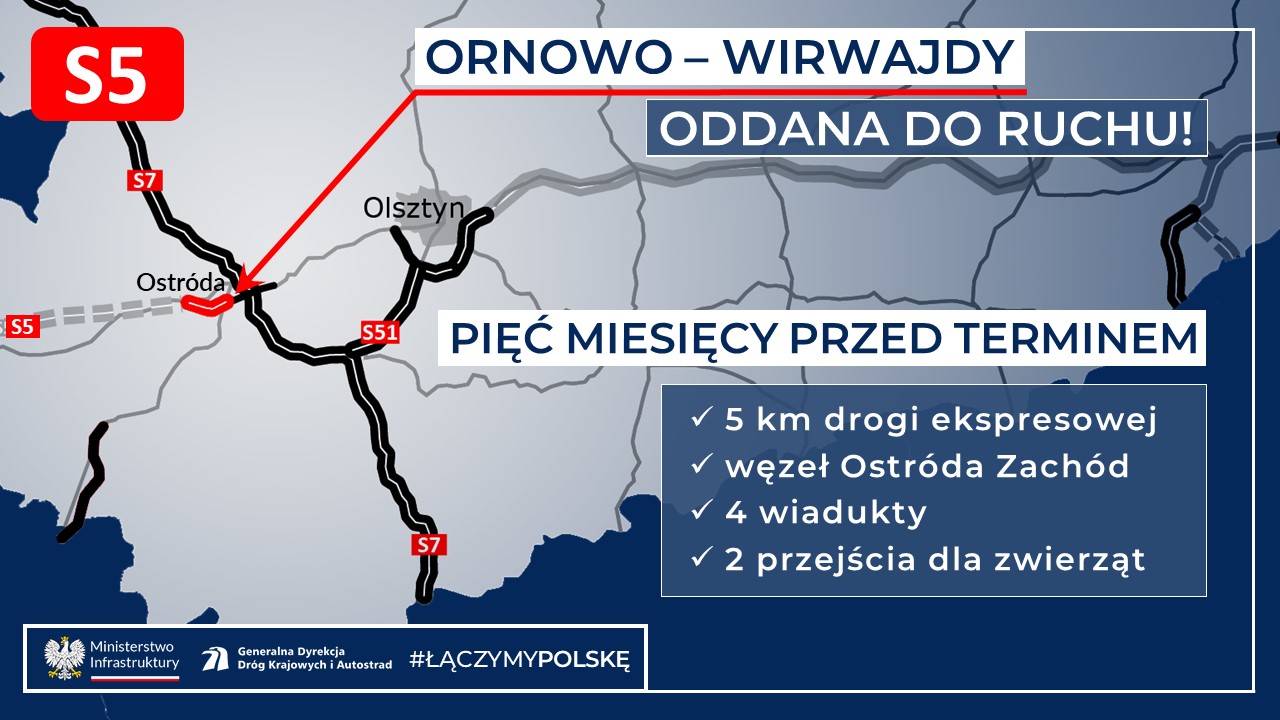 Kierowcy mogą już korzystać z drogi ekspresowej S5 Ornowo – Wirwajdy. 5-kilometrowy odcinek nowej trasy został oddany do ruchu pięć miesięcy przed terminem. Kontrakt o wartości 204 mln zł zrealizowała firma Budimex.