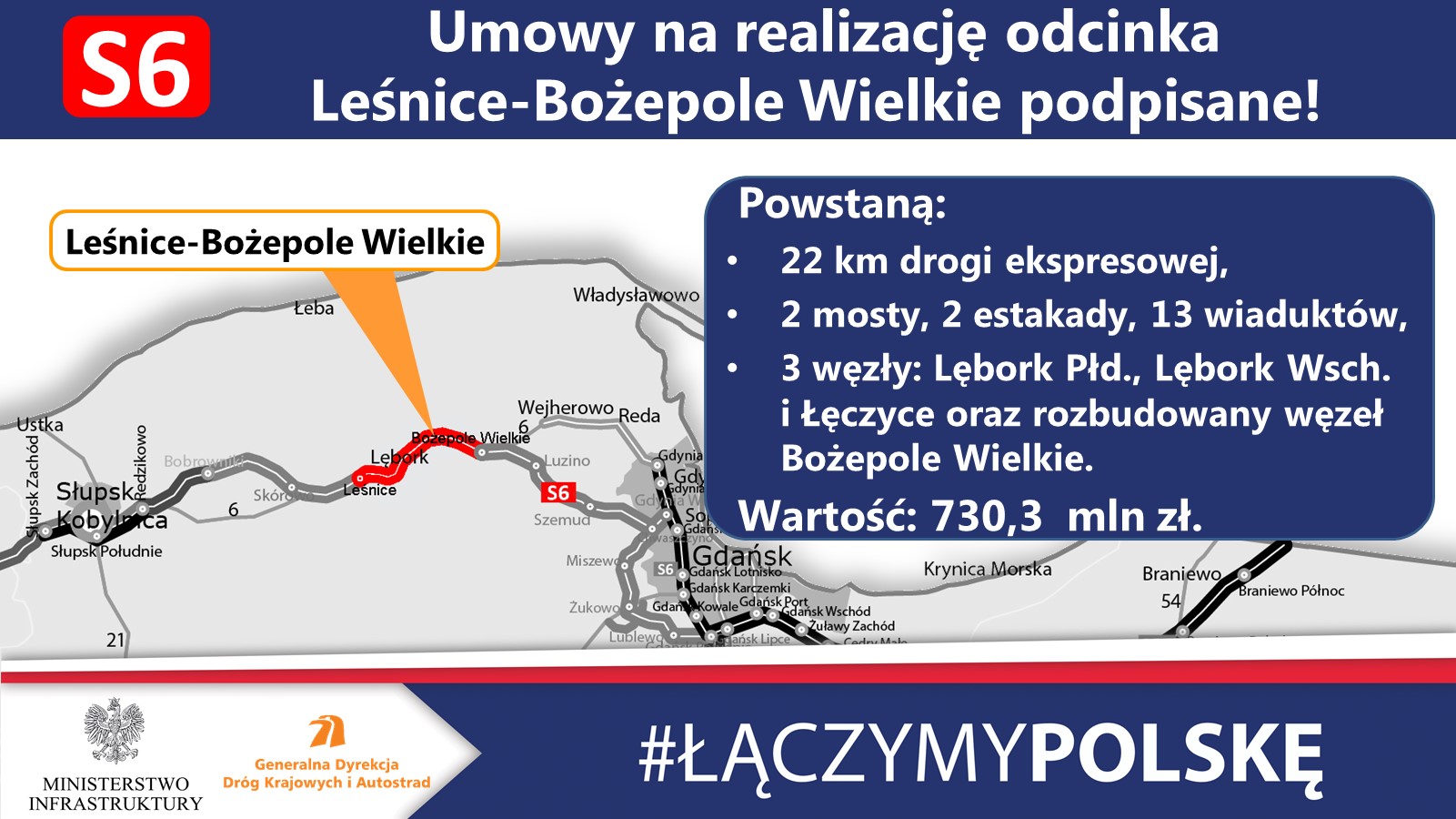 29 lipca 2019 r. podpisane zostały dwie umowy: na projekt i budowę oraz na nadzór inwestorski dla najdłuższego odcinka trasy S6 w województwie pomorskim, Leśnice - Bożepole Wielkie. Dzięki tej inwestycji kierowcy zyskają możliwość szybszego przejazdu w kierunku Trójmiasta, a mieszkańcy Lęborka południową obwodnicę miasta.