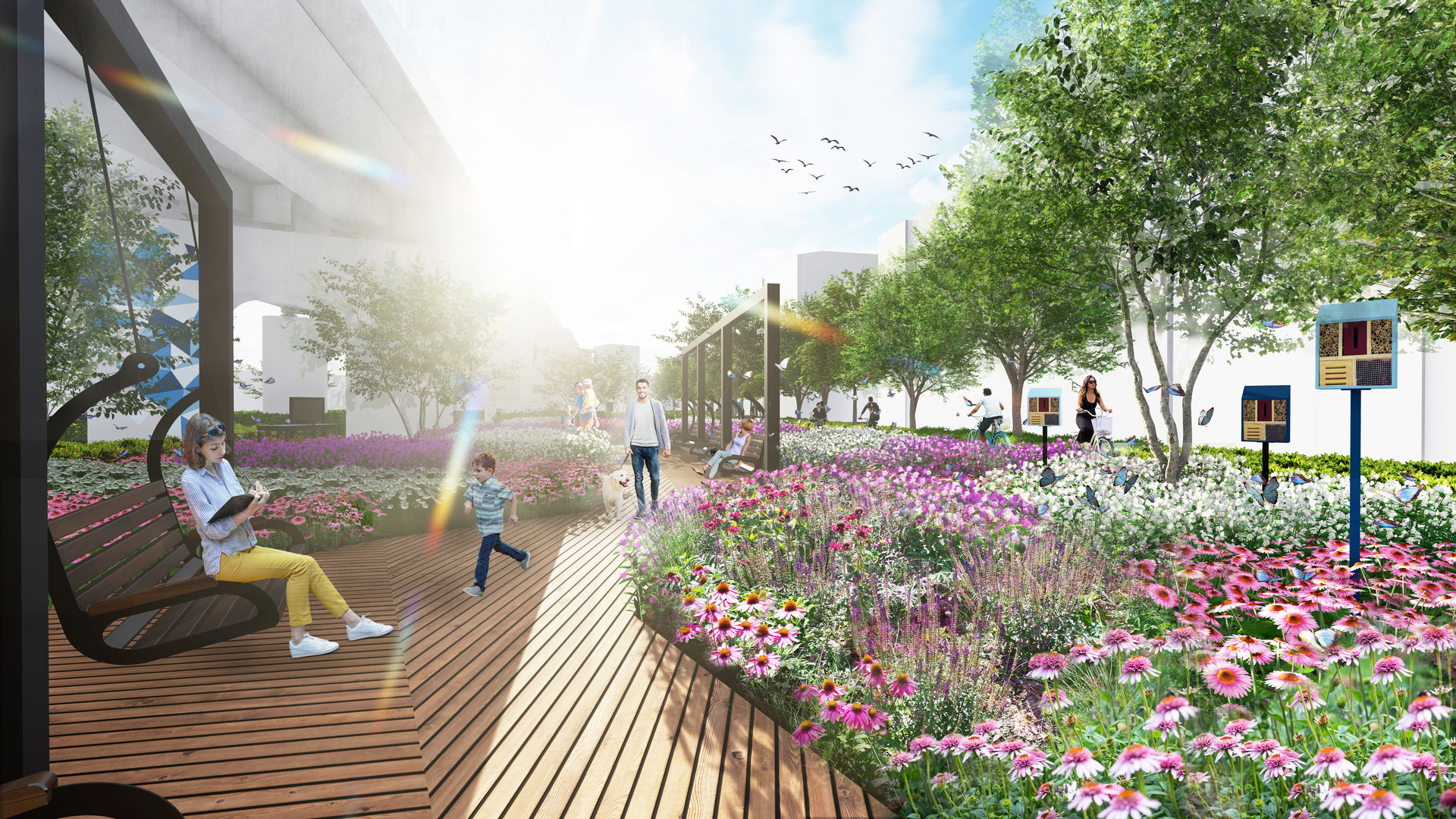 W projekcie zapewniono ciągłość połączenia zarówno pieszego, jak i rowerowego wzdłuż inwestycji kolejowej. Zgodnie z wolą mieszkańców, park podzielono na strefy funkcjonalne. Zbudowana zostanie również ścieżka edukacyjna dotycząca historii rozwoju transportu kolejowego w Polsce wraz z identyfikacją graficzną, która będzie jednocześnie formą uatrakcyjnienia nawierzchni i betonowych elementów estakady.