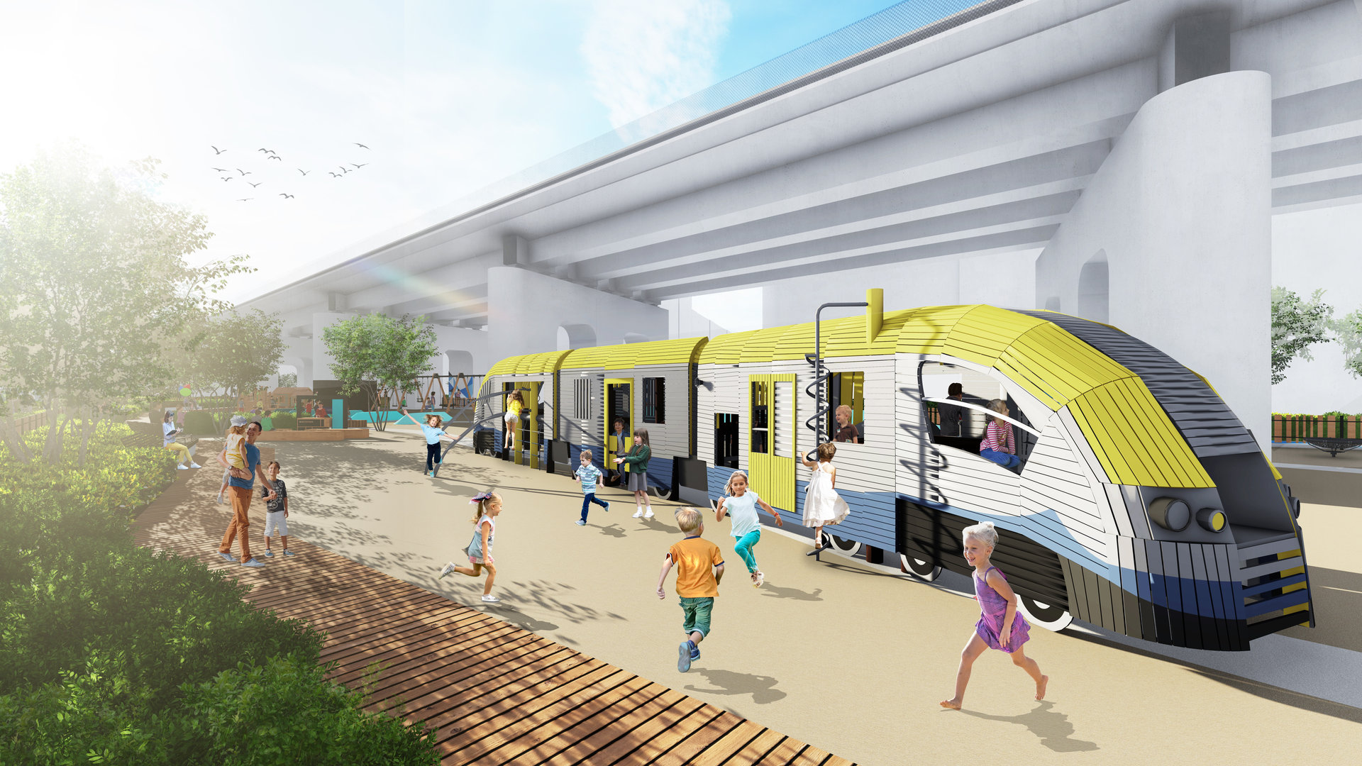 W pobliżu budynków mieszkalnych zaplanowano strefy, które nie będą generować wysokiego natężenia hałasu, w tym ogród sensoryczny oraz plac zabaw w formach nawiązujących do kolei.