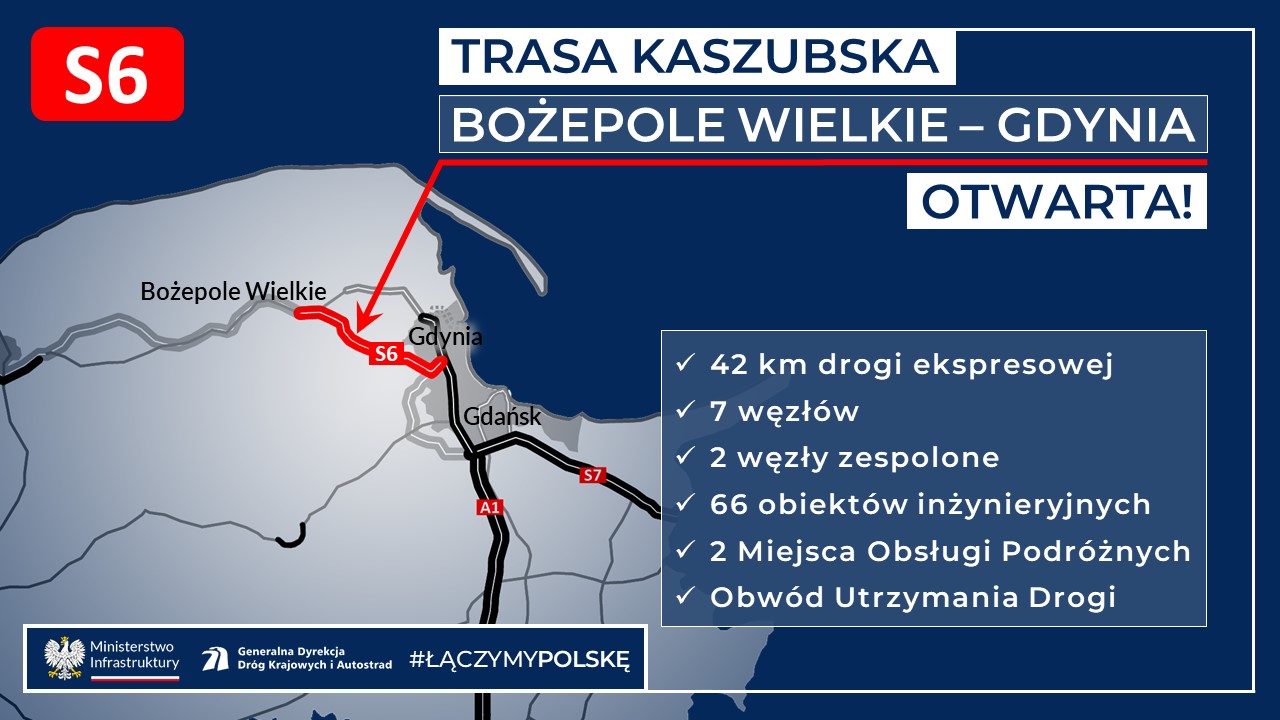Od 21 grudnia 2022 r. kierowcy mogą już korzystać z 42-kilometrowego odcinka drogi ekspresowej S6 Bożepole Wielkie – Gdynia Wielki Kack, czyli Trasy Kaszubskiej, stanowiącej obwodnicę Wejherowa, Redy i Rumi.