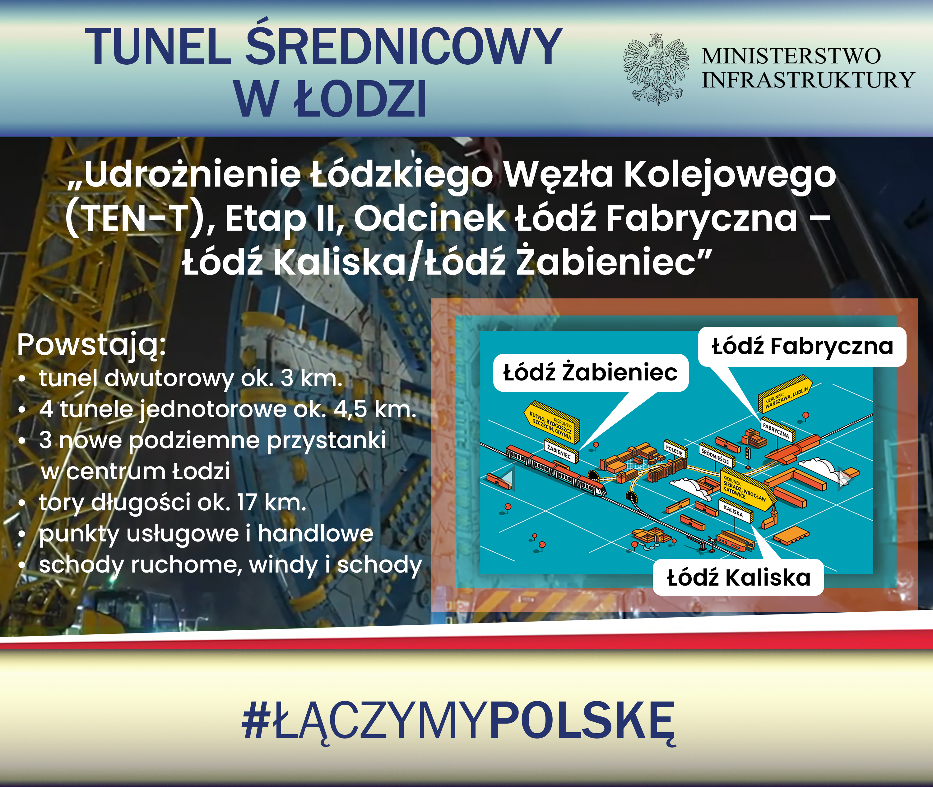 Tunel średnicowy to projekt „Udrożnienie Łódzkiego Węzła Kolejowego (TEN-T), etap II, odcinek Łódź Fabryczna - Łódź Kaliska/Łódź Żabieniec” - kontynuacja budowy dworca Łódź Fabryczna, który z dworca końcowego stanie się przelotowym. Przez ścisłe centrum Łodzi będą jeździły pociągi regionalne i dalekobieżne – na osi wschód – zachód (przez stacje Łódź Widzew, Fabryczna i Kaliska) i na osi północ – południe (przez stacje Łódź Widzew, Fabryczna, Żabieniec). Projekt jest niezwykle skomplikowany, wykonywany pod centrum miasta i w niełatwym terenie. Więcej informacji o projekcie http://tunel-laczypolske.pl/