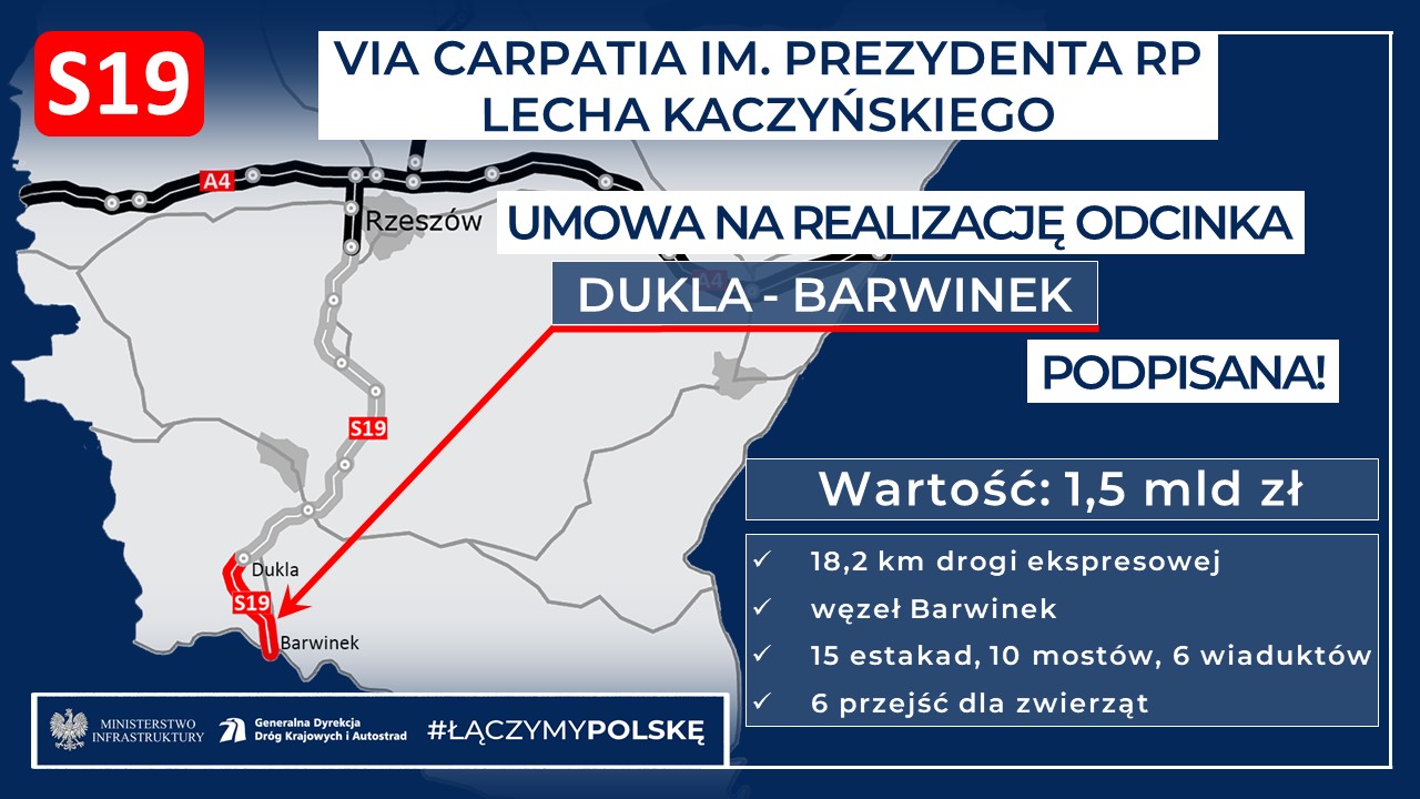 Rozpoczyna się realizacja drogi ekspresowej S19 na odcinku Dukla - Barwinek (granica państwa), stanowiącej część międzynarodowego szlaku Via Carpatia im. Prezydenta RP Lecha Kaczyńskiego. Wykonawcą zadania, na którego realizację 10 października 2022 r. Generalna Dyrekcja Dróg Krajowych i Autostrad zawarła umowę, będzie firma Polaqua.