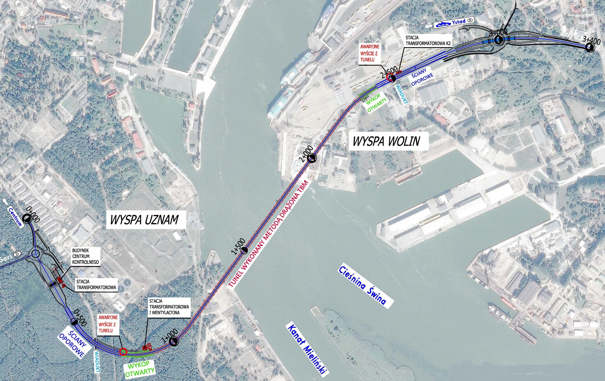 Inwestycja rozpoczyna się na wyspie Uznam w rejonie oczyszczalni ścieków przy ulicy Karsiborskiej. Następnie, równoległe do tej ulicy planowana trasa zagłębia się stopniowo i przechodzi pod ul. Karsiborską skręcając obok oczyszczalni ścieków w kierunku północnym w stronę cieśniny Świny. Przekroczenie Świny następuje na osi wyznaczonej pomiędzy terenami użytkowanymi przez Poltramp Yard oraz Bazą Paliw Płynnych - po stronie wyspy Uznam - a terenem nabrzeża użytkowanego przez Energopol SA na wyspie Wolin (w pobliżu Bazy Promów Morskich). Wyjście na poziom terenu następuje ok. 300 m przed skrzyżowaniem ul. Wolińskiej, Fińskiej i Duńskiej. Odcinek końcowy trasy zlokalizowano na skrzyżowaniu ulic: Fińskiej, Duńskiej i Wolińskiej.