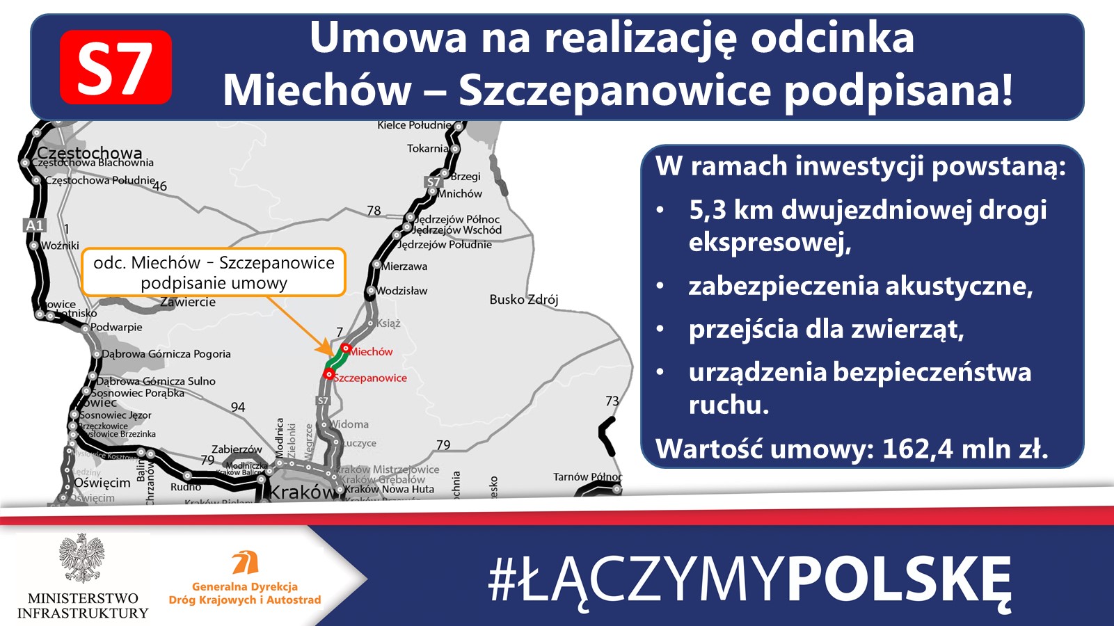 Generalna Dyrekcja Dróg krajowych i Autostrad zawarła umowę na projekt i budowę drogi ekspresowej S7 na odcinku Miechów – Szczepanowice. Wykonawcą kontraktu o wartości 162,4 mln zł będzie konsorcjum firm: Fabe Polskai i „SP” Sine Midas Stroy.