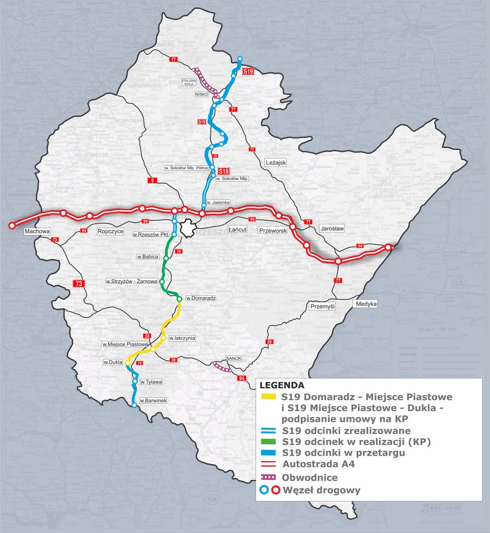 1 marca 2018 r. podkarpacki oddział GDDKiA zawarł umowy na wykonanie koncepcji programowej (KP) z pełnym rozpoznaniem geologicznym dla dwóch odcinków drogi ekspresowej S19 o łącznej długości 33,1 km. Wykonawca, firma IVIA SA, opracuje dokumentację dla odcinka węzeł Domaradz – węzeł Miejsce Piastowe (dł. 22,7 km) w ciągu 22 miesięcy za kwotę 9,3 mln zł, natomiast dla odcinka węzeł Miejsce Piastowe – węzeł Dukla (dł. 10,4 km) w ciągu 19 miesięcy za kwotę 4,5 mln zł.
