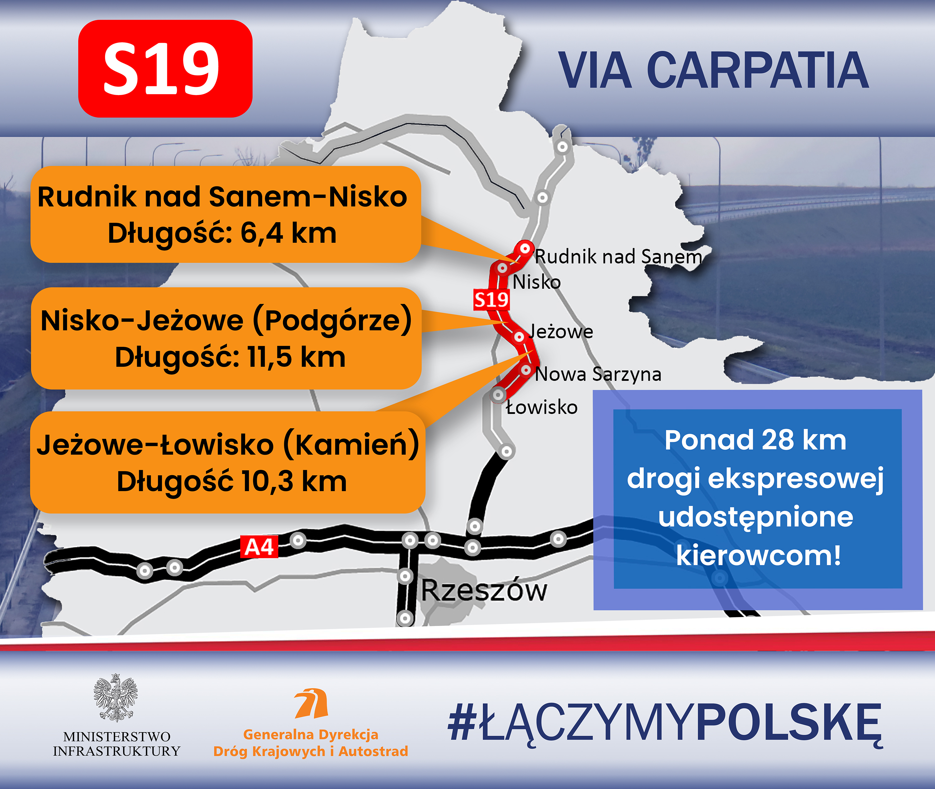 Od dziś kierowcy jadący przez Podkarpacie mogą już korzystać z prawie 30 kilometrów nowej drogi ekspresowej S19 od węzła Rudnik nad Sanem do węzła Łowisko (dotychczasowa nazwa – węzeł Kamień). Otwarty fragment drogi skróci podróż pomiędzy Lublinem i Rzeszowem.