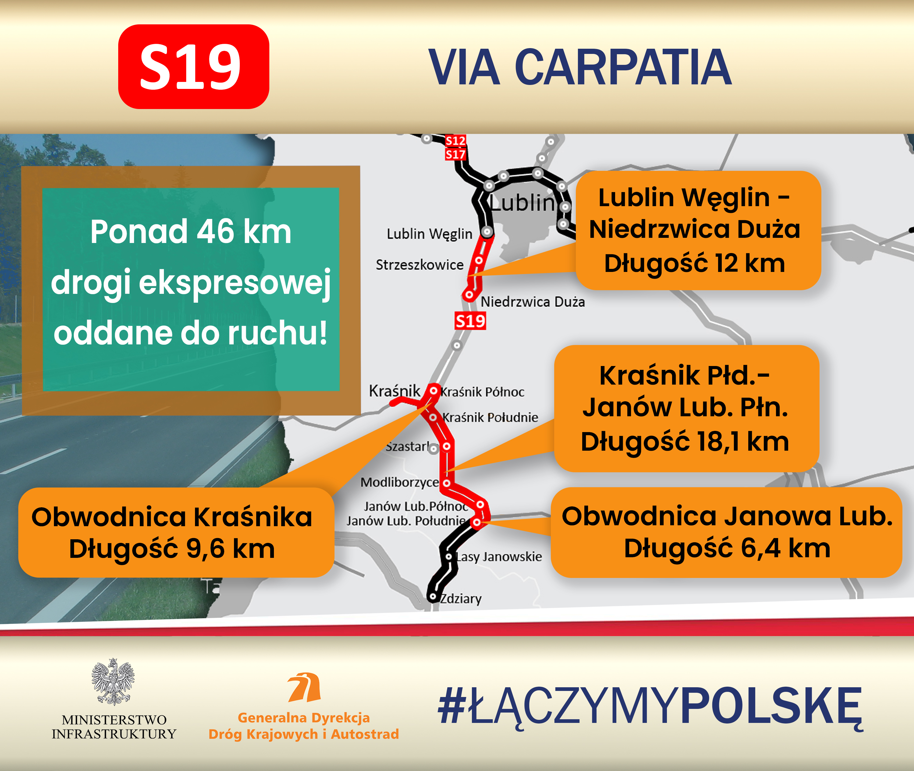 Kierowcy zyskali ok. 47 km nowej trasy ekspresowej na Lubelszczyźnie. Do ruchu zostały oddane cztery odcinki drogi ekspresowej S19 o nawierzchni bitumicznej: Lublin – Niedrzwica Duża, obwodnica Kraśnika, Kraśnik – Janów Lubelski i obwodnica Janowa Lubelskiego. Drodze ekspresowej S19 nadano nazwę „Via Carpatia im. Prezydenta RP Lecha Kaczyńskiego”. W uroczystości wzięli udział wicepremierzy: Jarosław Kaczyński i Jacek Sasin.