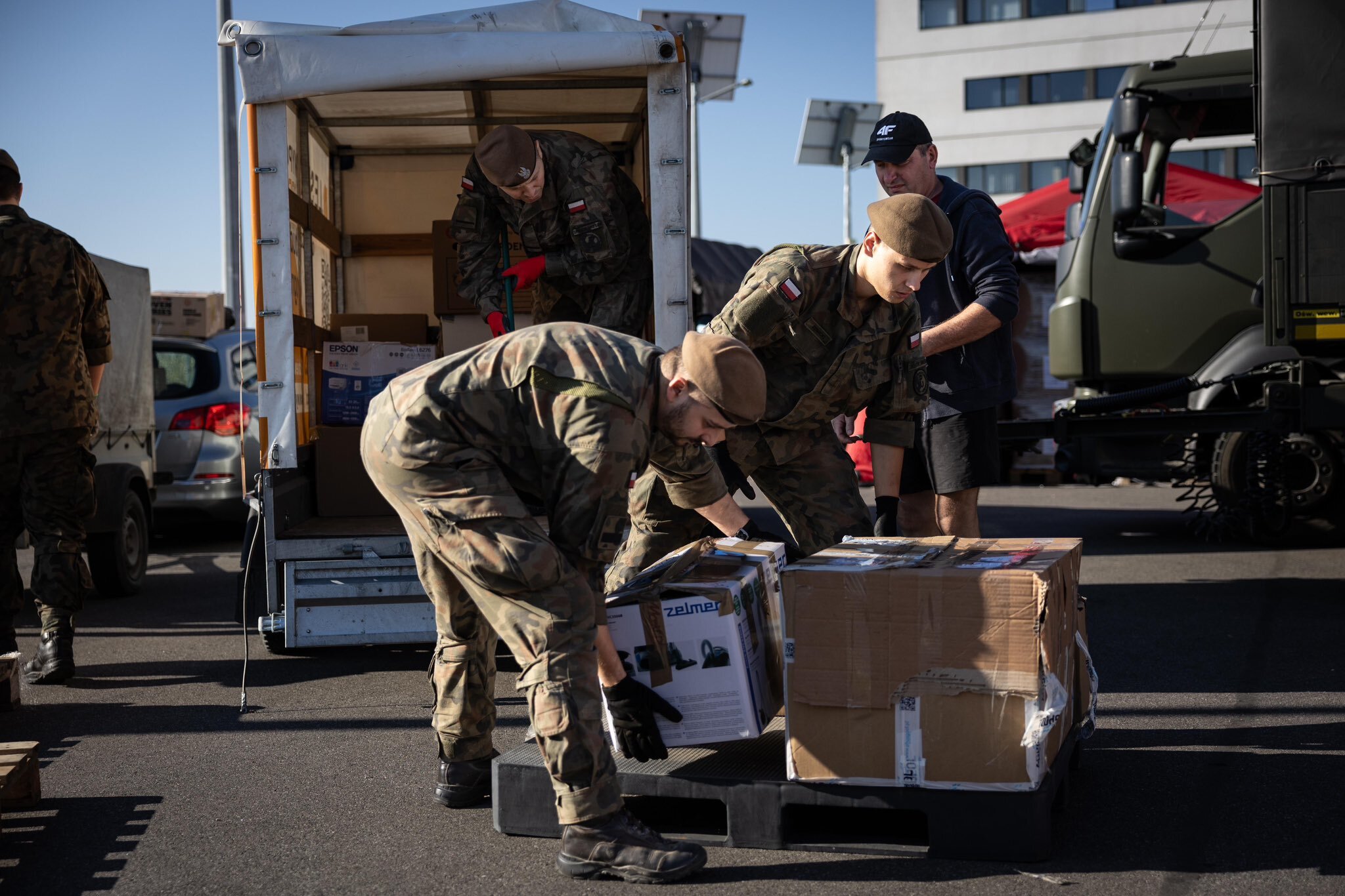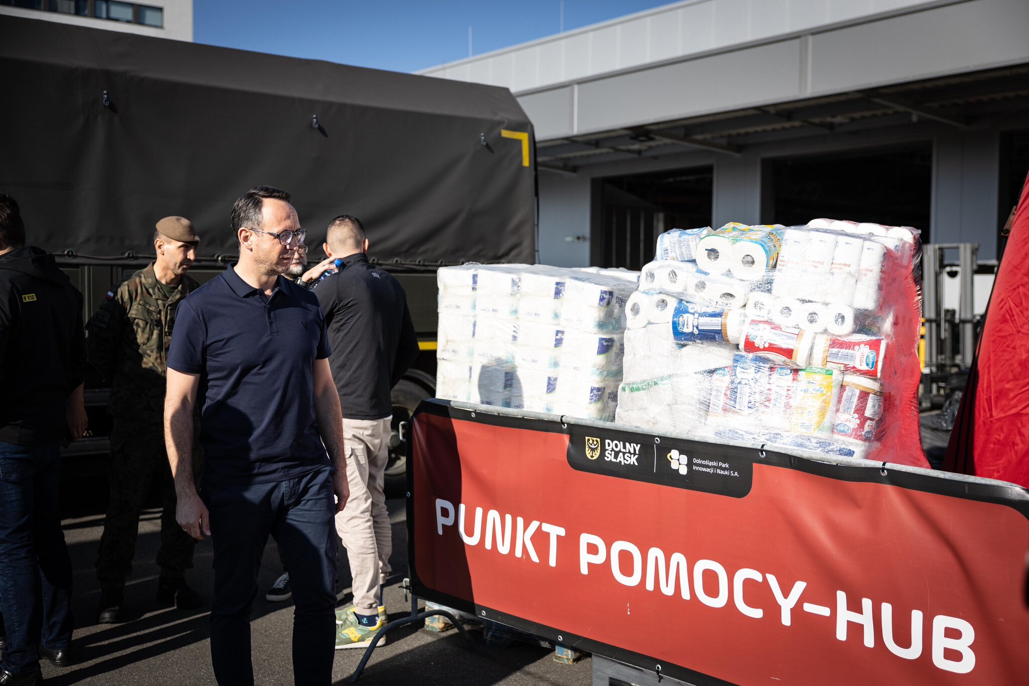 Rano minister infrastruktury Dariusz Klimczak wziął udział w posiedzeniu sztabu kryzysowego w stolicy Dolnego Śląska, gdzie przedstawił aktualną sytuację na drogach i kolei na terenach dotkniętych powodzią. Przekazał m.in. informację o zamknięciu zalanej linii kolejowej w Głogowie. Dziś sprawdził także stan zapasów w hubie pomocowym we Wrocławiu, gdzie gromadzona jest woda pitna, żywność, środki czystości, leki i inne niezbędne produkty, które trafiają do powodzian.
