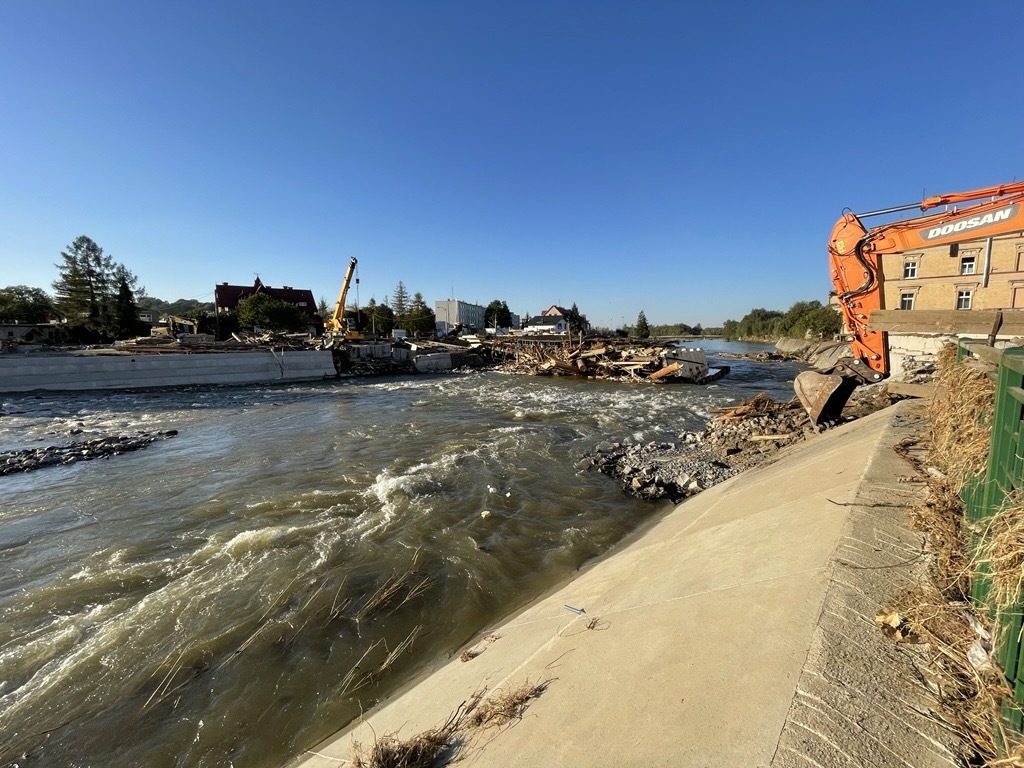 W Głuchołazach elemety zniszczonego mostu tymczasowego zostały wyciągnięte z rzeki. Trwa oczyszczanie koryta oraz przygotowania do budowy przyczółków w celu zamontowania tymczasowej przeprawy przez Białą Głuchołaską.