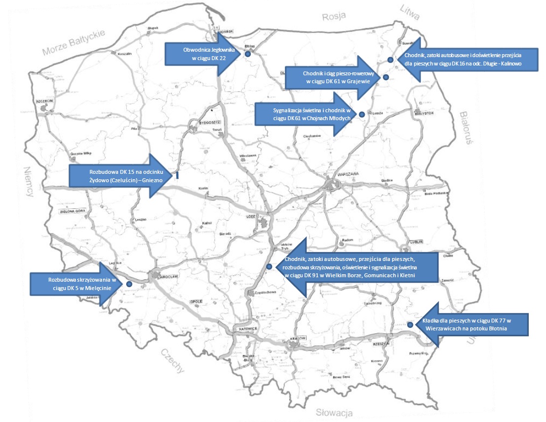 Minister Infrastruktury zatwierdził do realizacji programy inwestycji dla zadań drogowych w województwach dolnośląskim, łódzkim, podkarpackim, podlaskim, warmińsko–mazurskim i wielkopolskim. Łączny koszt tych zadań to ponad 308 mln zł. Inwestycje te są związane z poprawą bezpieczeństwa uczestników ruchu drogowego poprzez rozbudowę skrzyżowań, montaż sygnalizacji świetlnej, budowę chodników i ścieżek pieszo–rowerowych, budowę zatok autobusowych, budowę kładki dla pieszych, doświetlenie przejść dla pieszych czy budowę obwodnicy.