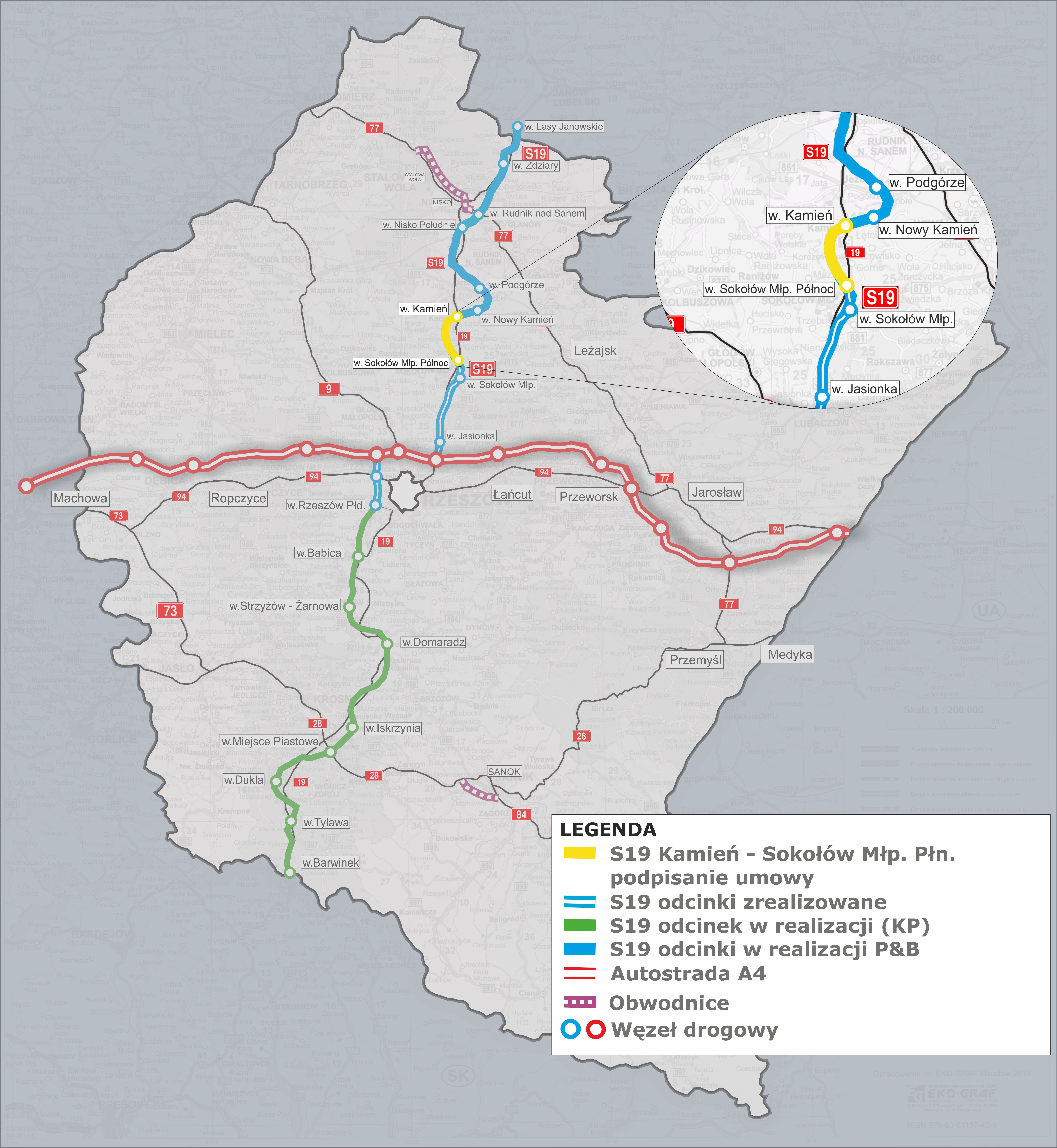 Wykonawcą odcinka S19 zlokalizowanego na terenach gmin Sokołów Małopolski i Kamień jest firma Budimex SA. Wartość umowy opiewa na 286,4 mln zł brutto. Inwestycja ma zostać zrealizowana w przeciągu 34 miesięcy z uwzględnieniem przerw zimowych na etapie prac budowlanych. Zadaniem wykonawcy będzie opracowanie projektu, uzyskanie decyzji o zezwoleniu na realizację inwestycji drogowej, budowa drogi wraz z obiektami inżynierskimi i infrastrukturą towarzyszącą , opracowanie dokumentacji powykonawczej oraz uzyskanie decyzji o pozwoleniu na użytkowanie.
