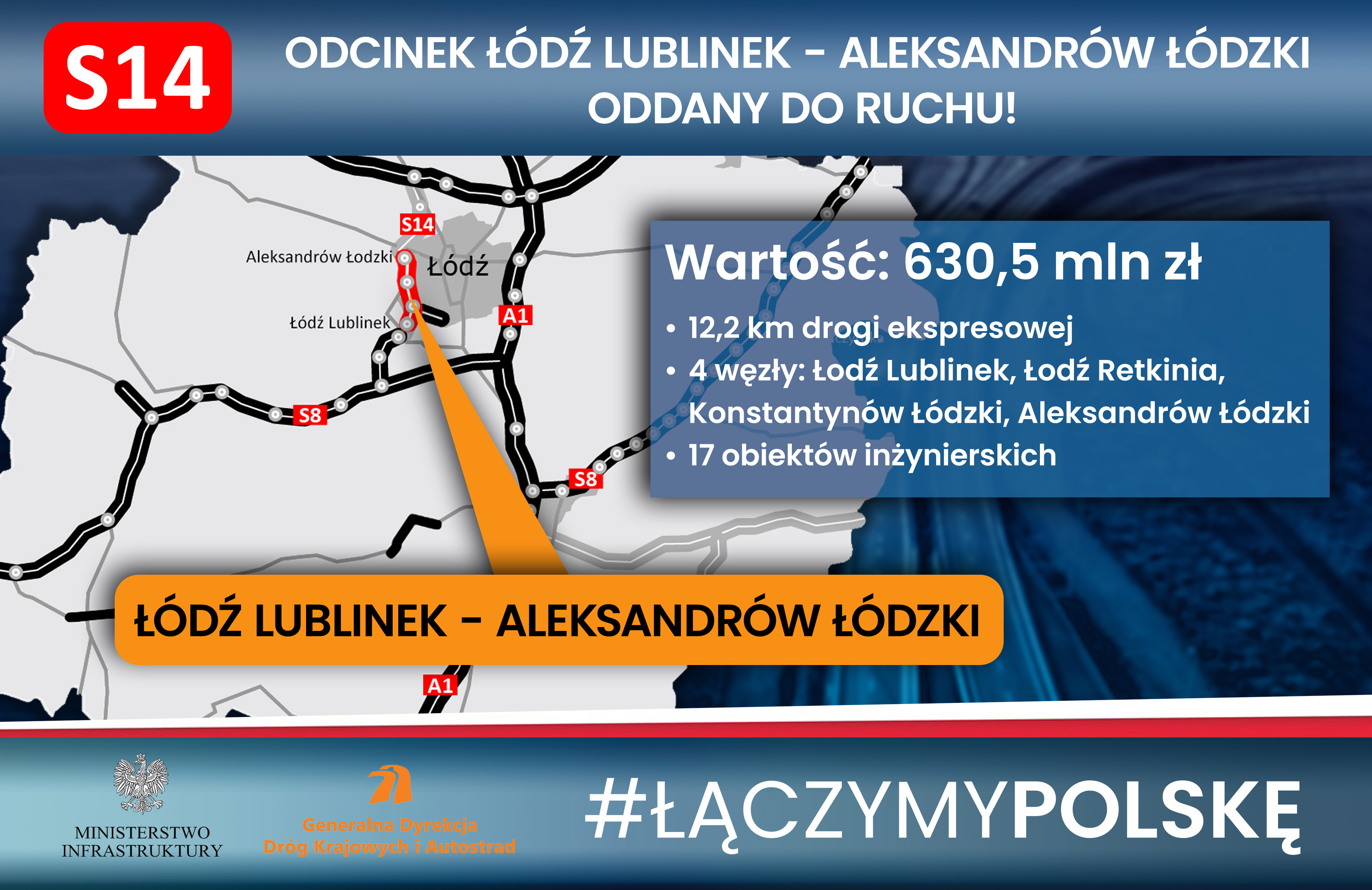 Oddany do ruchu odcinek S14 to trzeci etap powstawania tej ważnej dla całej aglomeracji łódzkiej drogi. Pierwszy odcinek, od Łodzi do Dobronia został oddany do ruchu blisko 10 lat temu, latem 2012 r. Kolejny, między węzłami Dobroń i Róża realizowany był w ramach budowy drogi ekspresowej S8. Do ruchu przekazany został latem 2014 r. Do zakończenia pozostał jeszcze ostatni, 16-kilometrowy fragment trasy od węzła Aleksandrów Łódzki do węzła Emilia. Zaawansowanie prac sięga tam 70 proc. i wszystko wskazuje na to, że zgodnie z planami zostanie oddany do ruchu wiosną przyszłego roku.