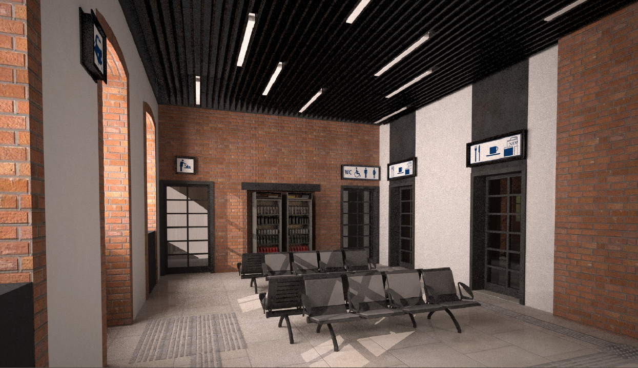 Zmieni się także wnętrze budynku. Przywrócona zostanie obsługa podróżnych, która będzie odbywać się w holu pełniącym jednocześnie funkcję ogrzewanej i klimatyzowanej poczekalni. Zaaranżowano ją w nowoczesny sposób, nawiązując poprzez częściowo ceglane wykończenie ścian do wyglądu elewacji dworca. Pozostałe ściany zostaną pomalowane na kolory utrzymane w odcieniach szarości, tak jak posadzka wykonana z wielkoformatowych granitowych płyt. Aranżację wnętrza uzupełni nowoczesne oświetlenie, umieszczone w podwieszanym, listwowym suficie. Poczekalnia będzie wyposażona również w nowe ławki, kosze, gabloty z rozkładami jazdy oraz elektroniczne tablice przyjazdów i odjazdów pociągów. W jej sąsiedztwie zaprojektowano pomieszczenia kas biletowych, dwa lokale na wynajem, a w zachodnim skrzydle na dwóch kondygnacjach będą się mieścić powierzchnie przeznaczone dla samorządu. Resztę powierzchni zajmą pomieszczenia techniczne oraz biura.