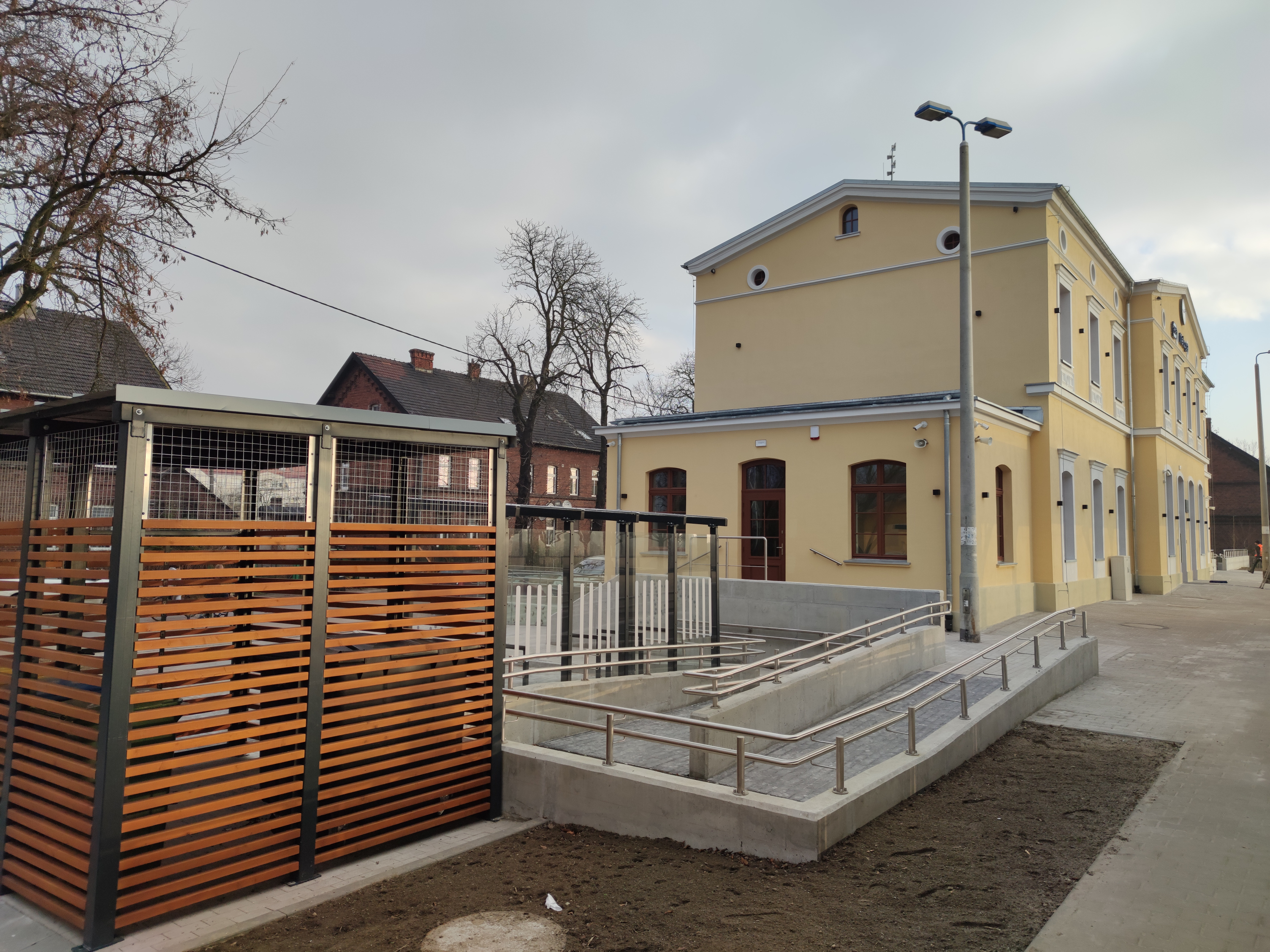 Metamorfozę przeszło bezpośrednie otoczenie dworca. Po wschodniej stronie budynku powstał mini plac dworcowy z na nowo zaaranżowaną zielenią, małą architekturą (ławki, kosze, oświetlenie) oraz miejscami postojowymi dla osób z niepełnosprawnościami, rodzin z dziećmi oraz typu kiss&ride. Natomiast przy zachodniej elewacji parking dla samochodów oraz wiata rowerowa ze stojakami dla jednośladów.