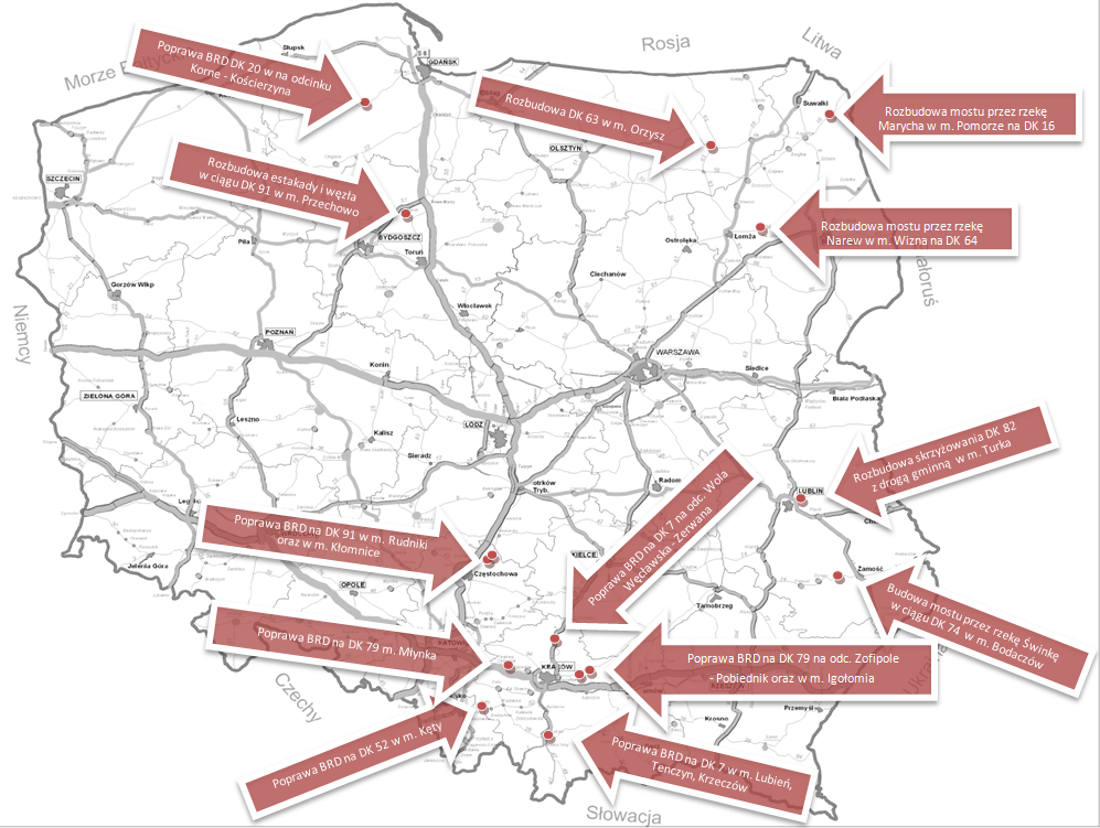 Minister Infrastruktury zatwierdził do realizacji 12 programów inwestycji i 3 aneksy dla zadań drogowych, których łączny koszt to ok. 136 mln zł. Są to zadania związane z rozbudową istniejących odcinków dróg krajowych wraz z dostosowaniem ich nośności do ruchu ciężkiego o nacisku 11,5 t/oś, budową lub przebudową mostów i estakad. Inwestycje te poprawią bezpieczeństwo uczestników ruchu drogowego poprzez modernizację dróg, w szczególności przebudowę skrzyżowań, rond, pasów do skrętu w lewo, przejść dla pieszych, sygnalizacji świetlnych, chodników i ścieżek rowerowych. Zadania te będą realizowane w 7 województwach: pomorskim, kujawsko-pomorskim, warmińsko-mazurskim, podlaskim, śląskim, małopolskim oraz lubelskim.