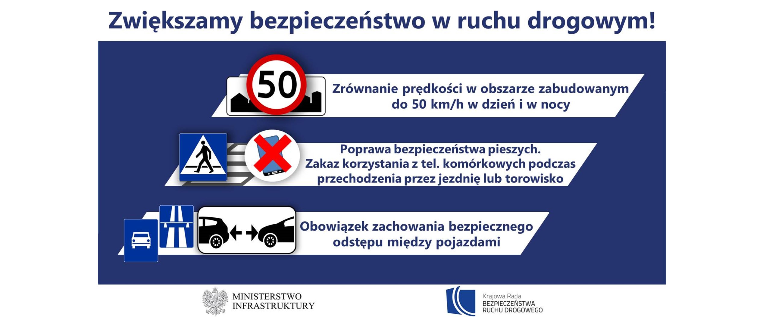 Ujednolicenie dopuszczalnej prędkości w obszarze zabudowanym niezależnie od pory dnia, zwiększenie zakresu ochrony pieszego w rejonie przejścia dla pieszych, obowiązek zachowania szczególnej ostrożności przez pieszego oraz uregulowanie kwestii bezpiecznej odległości między pojazdami na autostradach i drogach ekspresowych przewiduje projekt ustawy wprowadzający rozwiązania mające na celu poprawę bezpieczeństwa uczestników ruchu drogowego.