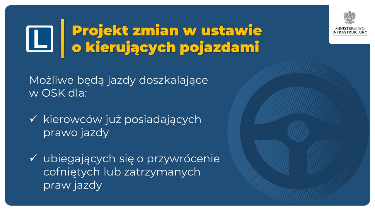 Ministerstwo Infrastruktury rozpoczęło prace nad projektem ustawy zakładającym szereg zmian w przepisach ustawy o kierujących pojazdami. Projekt nowelizacji jest przygotowywany w związku postulatami organizacji społecznych zrzeszających instruktorów nauki jazdy, egzaminatorów i kierowców o dokonanie szeregu zmian w zasadach przeprowadzania i oceny egzaminu państwowego na prawo jazdy oraz w zasadach organizacji egzaminów w Wojewódzkich Ośrodkach Ruchu Drogowego. W ich ocenie niska zdawalność części praktycznej egzaminu państwowego nie jest wyłącznie spowodowana słabą jakością wyszkolenia kandydatów na kierowców.