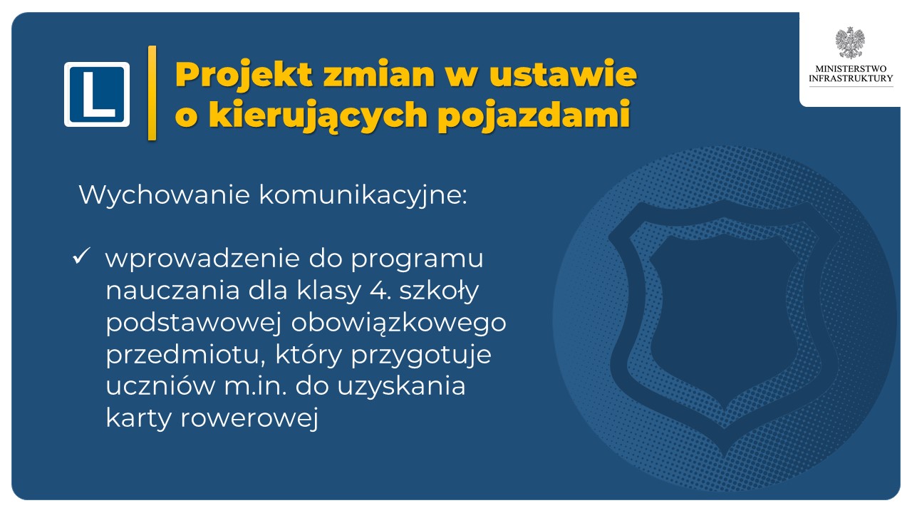 Najważniejsze zmiany będą dotyczyły najmłodszych uczestników ruchu drogowego. W programie nauczania dla klasy 4. szkoły podstawowej wprowadzony zostanie obowiązkowy przedmiot „wychowanie komunikacyjne”. Będą to zajęcia, w ramach których uczniowie będą m.in. przygotowywali się do uzyskania karty rowerowej.