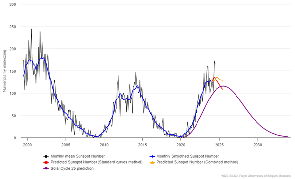 Na wykresie widoczna jest liczba plam słonecznych w czasie od 2000 roku, niebieską linią zaznaczono uśrednioną i wygładzoną liczbę plam słonecznych w miesiącu, natomiast fioletowa linia wskazuje przewidywania odnośnie obecnego cyklu słonecznego. Jak widać w chwili obecnej średnia liczba plam słonecznych jest powyżej przewidywań.