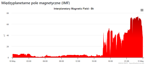 Z ostatnią bardzo silną burzą geomagnetyczną, najwyższej kategorii G5, mieliśmy do czynienia w dniach 10-11 maja bieżącego roku. Natężenie międzyplanetarnego pola magnetycznego pochodzącego ze Słońca wzrosło wtedy z kilku nanotesli do ponad 70 nanotesli, natomiast prędkość wiatru słonecznego z 400 km/s do około 800 km/s co spowodowało spektakularną zorzę polarną widoczną nawet w północnej Afryce, a w Polsce mogliśmy ją podziwiać w zenicie – co nie zdarza się często.