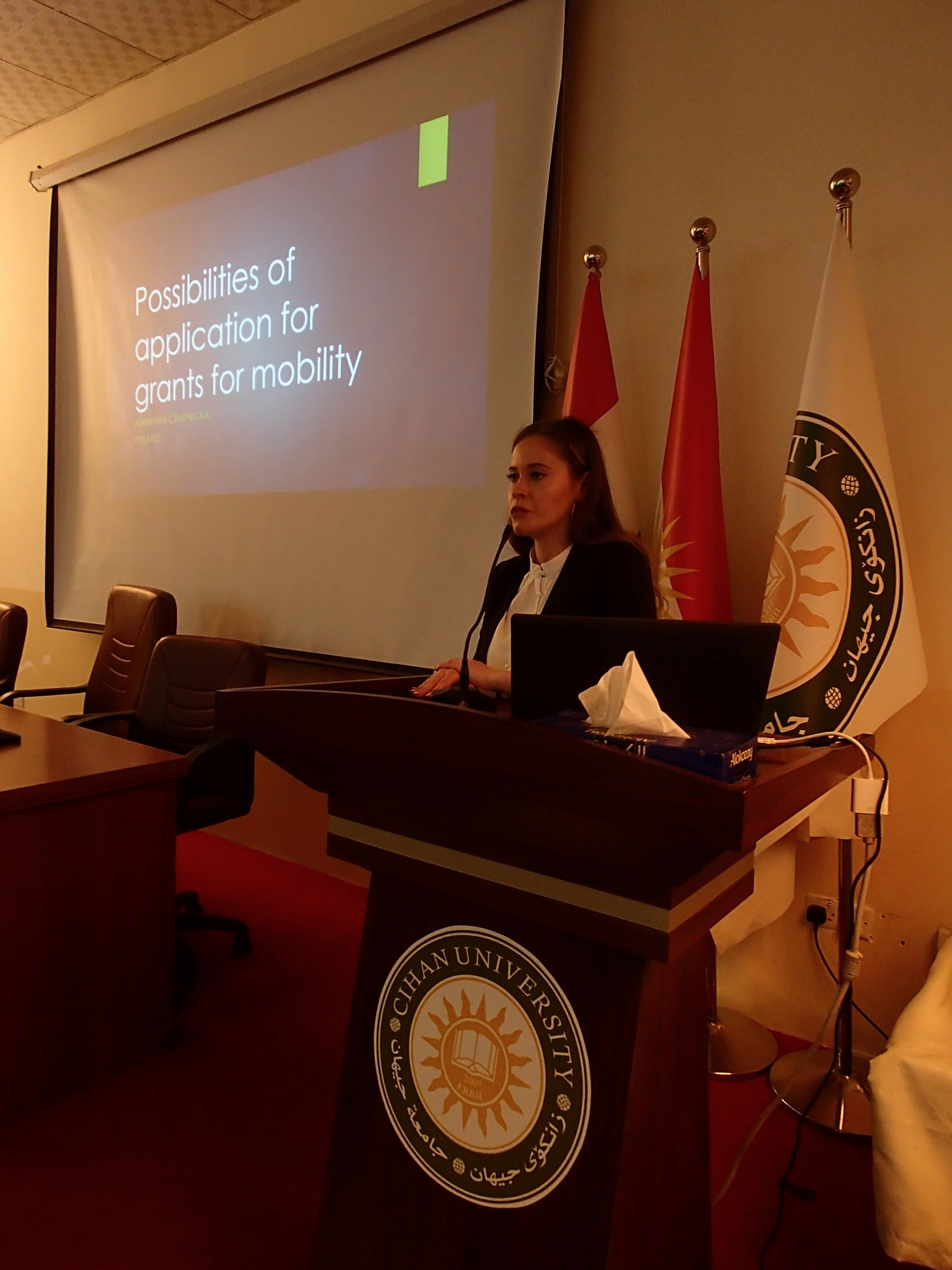 Adrianna Czarnecka z Uniwersytetu im. Mikołaja Kopernika w Toruniu, w trakcie pobytu w Regionie Irackiego Kurdystanu odwiedziła Uniwersytet Cihan w Irbilu, gdzie zaprezentowała dotychczasowe wyniki swoich badań nad "kapitałem państwowotwórczym" Kurdów oraz zaprezentowała kadrze naukowej oraz studentom możliwości ubiegania się o stypendia w Polsce oraz tryb rejestracji patentów.