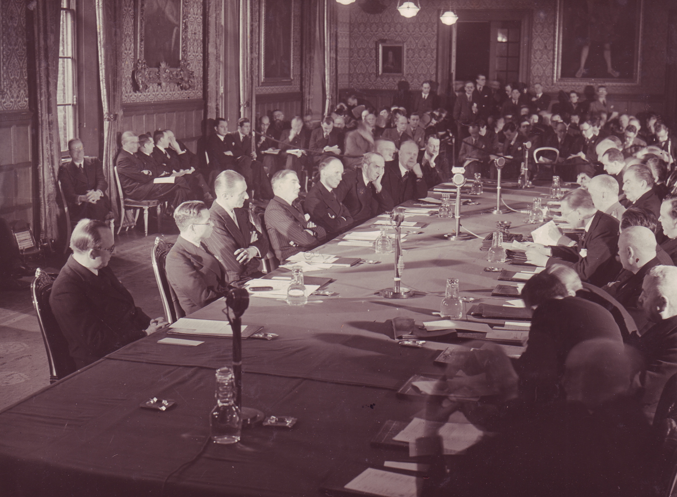 Sala obrad: przy głosie premier Władysław Sikorski (nad tekstem przemówienia, częściowo zasłonięty), obok niego po lewej Edward Raczyński; po przeciwnej stronie stołu przedstawiciele mocarstw oraz dominiów brytyjskich – pierwszy od lewej ambasador ZSRR Aleksandr Bogomołow, drugi poseł Republiki Chińskiej Wen She, trzeci ambasador USA Anthony Drexel Biddle, czwarty minister spraw zagranicznych Wielkiej Brytanii Anthony Eden, piąty ambasador Kanady Vincent Massey, szósty Stanley Bruce, Wysoki Komisarz Australii.