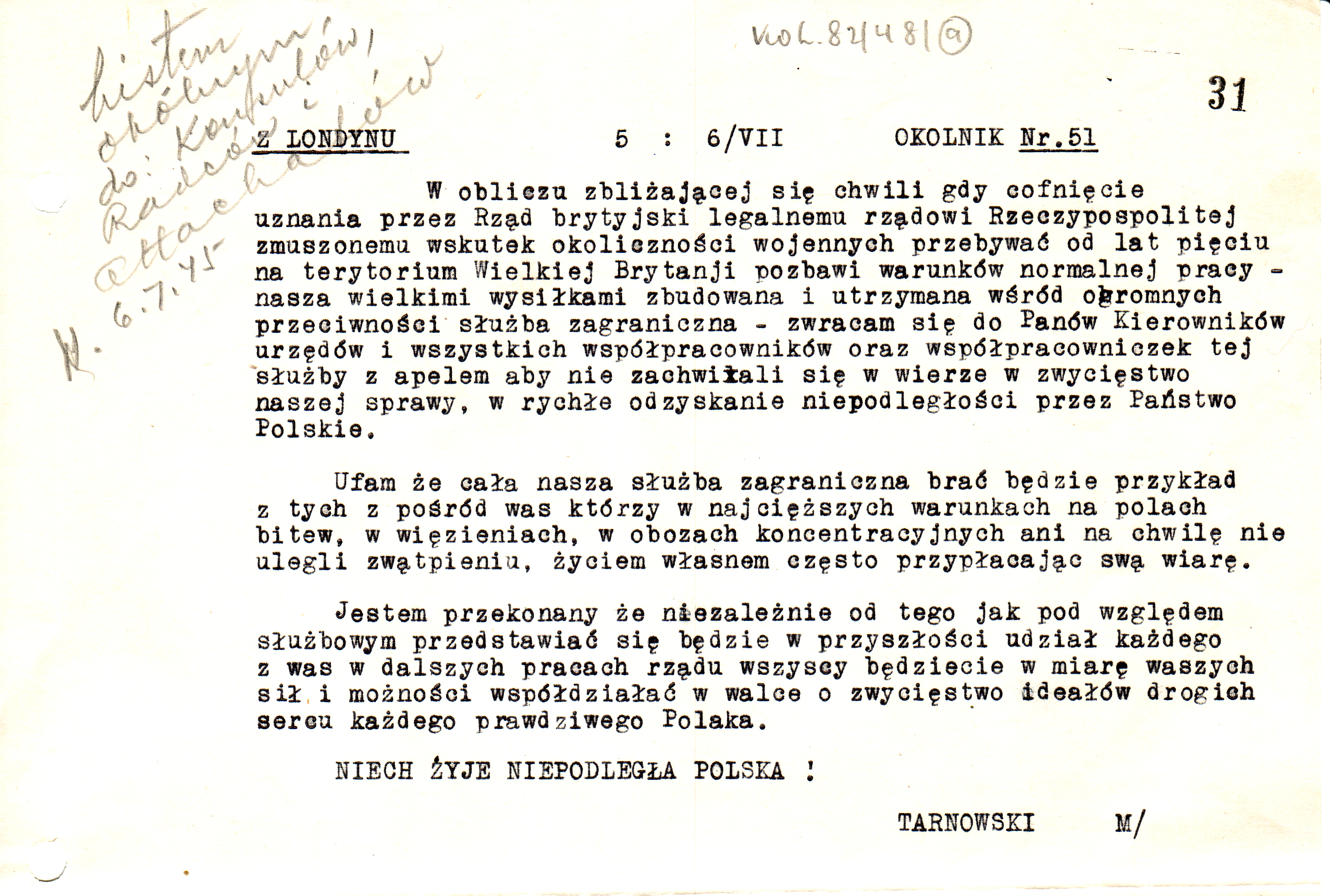 6 lipca 1945 roku, w dzień po cofnięciu uznania rządowi polskiemu przez najważniejsze kraje koalicji, minister Adam Tarnowski skierował do szefów wszystkich polskich placówek okólnik, w którym stwierdził: „Jestem przekonany, że niezależnie od tego, jak pod względem służbowym przedstawiać się będzie w przyszłości udział każdego z was w dalszych pracach rządu, wszyscy będziecie w miarę waszych sił i możności współdziałać w walce o zwycięstwo ideałów drogich sercu każdego prawdziwego Polaka. Niech żyje niepodległa Polska!”