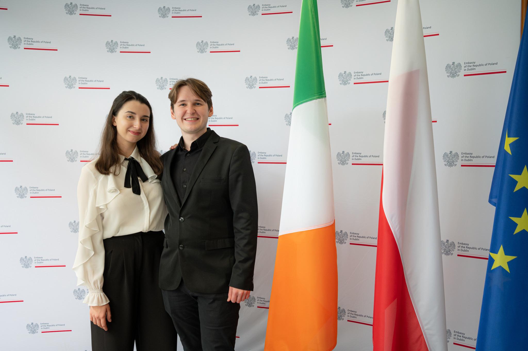 The official part of the reception began by the national anthems of Poland and Ireland performed by the young Polish musicians Natalia Jaworek (violin) and Jakub Ładowski (piano), who also later delighted guests with a nocturne by Chopin. During the event Polish wine from the Jantoń vineyard was served, which had been especially imported for this occasion. On the walls artwork was displayed by the talented Irish–based Polish painter Paweł Jasiński.