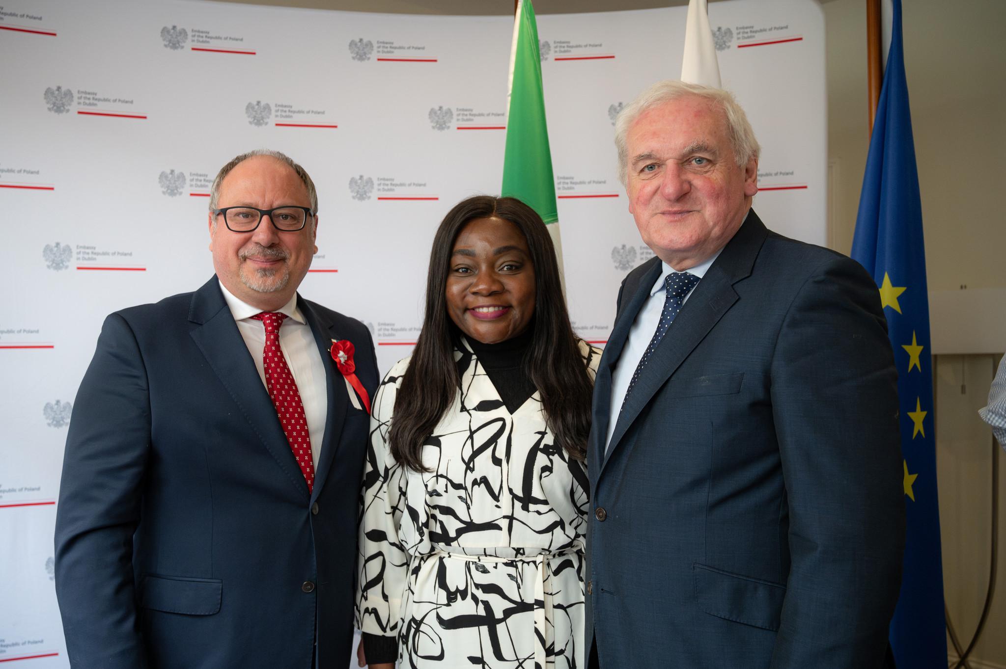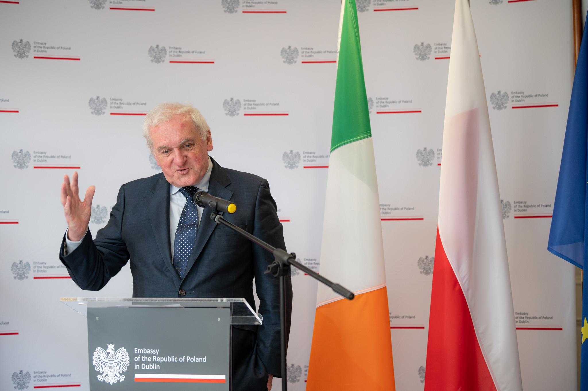 The guest of honour was Mr. Bertie Ahern, who was Taoiseach at the time of Poland’s EU accession 20 years ago. Our special guest was Mrs. Marie Heaney, the wife of Irish poet and Nobel laureate Seamus Heaney who wrote the poem "Beacons at Bealtaine" to celebrate the EU Enlargement on May 1st 2004 in Dublin. He was a great friend to Poland and interested in Polish poetry, literature, and history for years. He befriended Czesław Miłosz, to whom he dedicated the poem "The Master", and he was well acquainted with the poetry of Zbigniew Herbert. Moreover, together with Stanisław Barańczak, he translated "Laments" by Jan Kochanowski, one of the greatest works of Renaissance XVI-century poetry. Interestingly the next day the Department of Foreign Affairs organised a celebration of 20 years of membership where again Seamus Heaney’s poem was the main focus and Marie Heaney and her family were the guests of honour.