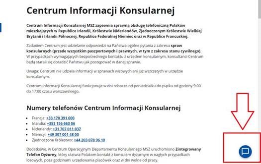 Usługę można wywołać poprzez kliknięcie ikony dymku czatu 🗨️ umiejscowionej w prawym dolnym rogu strony: https://www.gov.pl/web/irlandia/informacje-konsularne